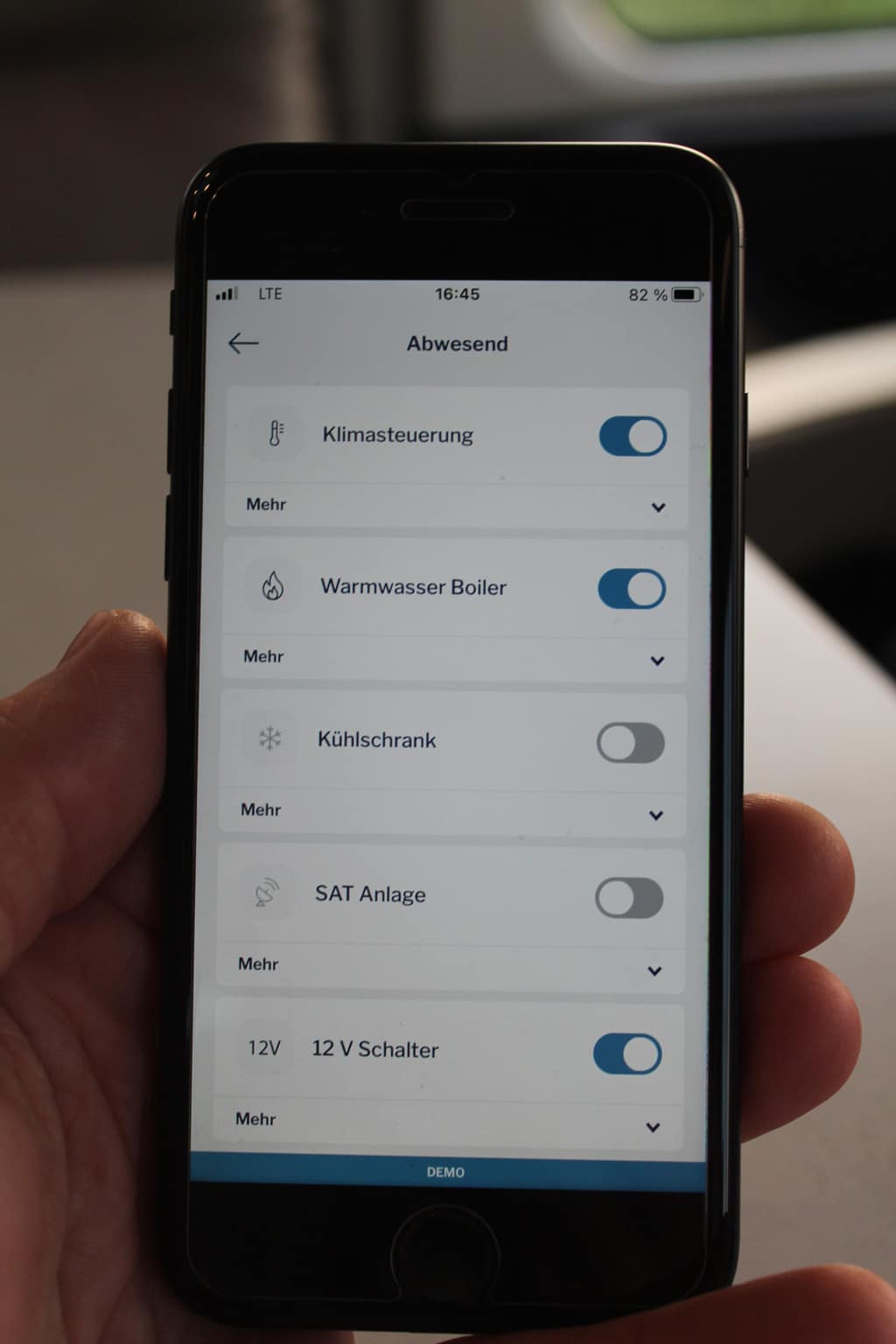 Weitere Besonderheit der App sind konfigurierbare Szenarien wie zum Beispiel Ankunft, Abfahrt, Gute Nacht, Guten Morgen, Anwesend, Abwesend. Wählt der Camper etwa das Szenario Abfahrt, so fährt das System beispielsweise, falls vorhanden, die Sat-Schüssel ein, löscht die Beleuchtung im Wohnraum und stellt die Frischwasserpumpe ab. So helfen die Szenarien, dass man nichts vergisst und beugt somit sogar Schäden vor.