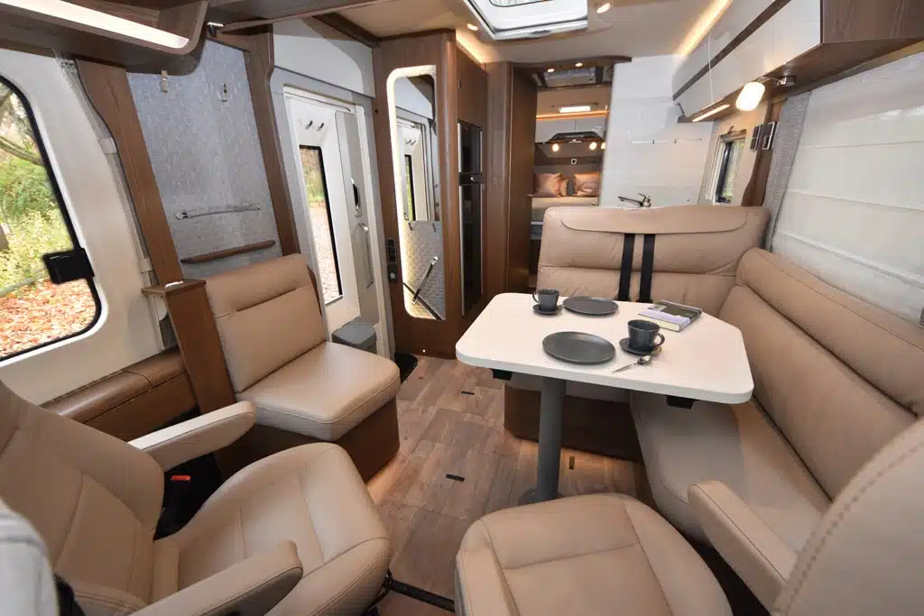 Das Testfahrzeug ist mit jeder Menge Technik ausgestattet, etwa mit der Alde- Warmwasserheizung, mit dimmbarer Ambientebeleuchtung, dem trivalenten Kühlschrank mit beiderseitigem Türanschlag, Klimaanlage, Satellitenanlage und, und, und. Alles Dinge, die sich mit der neuen Hymer Connect App abfragen und einstellen lassen. Und das nicht nur im Fahrzeug, sondern von jedem beliebigen Ort aus.