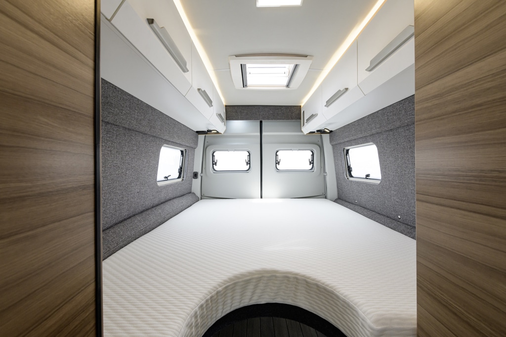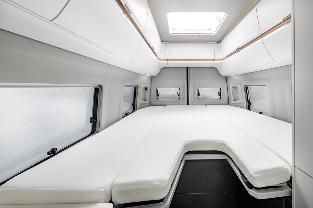 Auch im Grand California wartet das Längsdoppelbett mit großzügigen Abmessungen und bequemer Unterfederung mit Tellerfedern auf. Ärgerlich jedoch: Die Matratzen sind ungünstig längs geteilt. Das erleichtert zwar den Zugriff auf die Servicedeckel darunter, doch liegt man ständig „im Graben“.