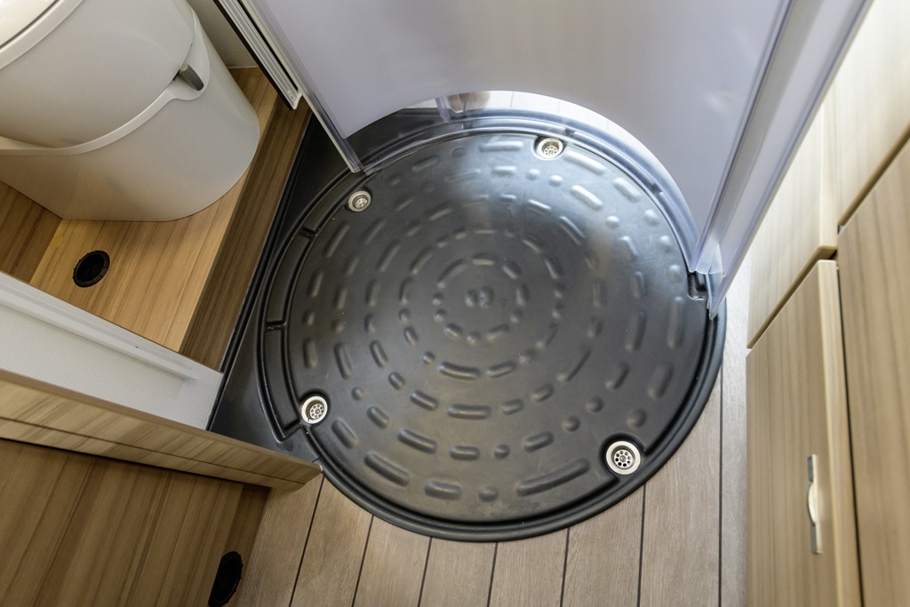 Ganz verschiedene Lösungen zeigen die Bäder. Knaus setzt auf ein Raumbad, bei dem im Durchgang zwischen Küche und Bett eine kreisrunde Duschkabine mit 76 Zentimeter Durchmesser entsteht. Das ist geräumig, versperrt aber den Durchgang und den Zugang zum Kühlschrank. Wird die Dusche nicht gebraucht, schiebt man die Kunststofftüren vor WC und Waschbecken und legt eine Platte auf die Duschtasse. Ob dieses Konzept gefällt, bleibt Geschmackssache.