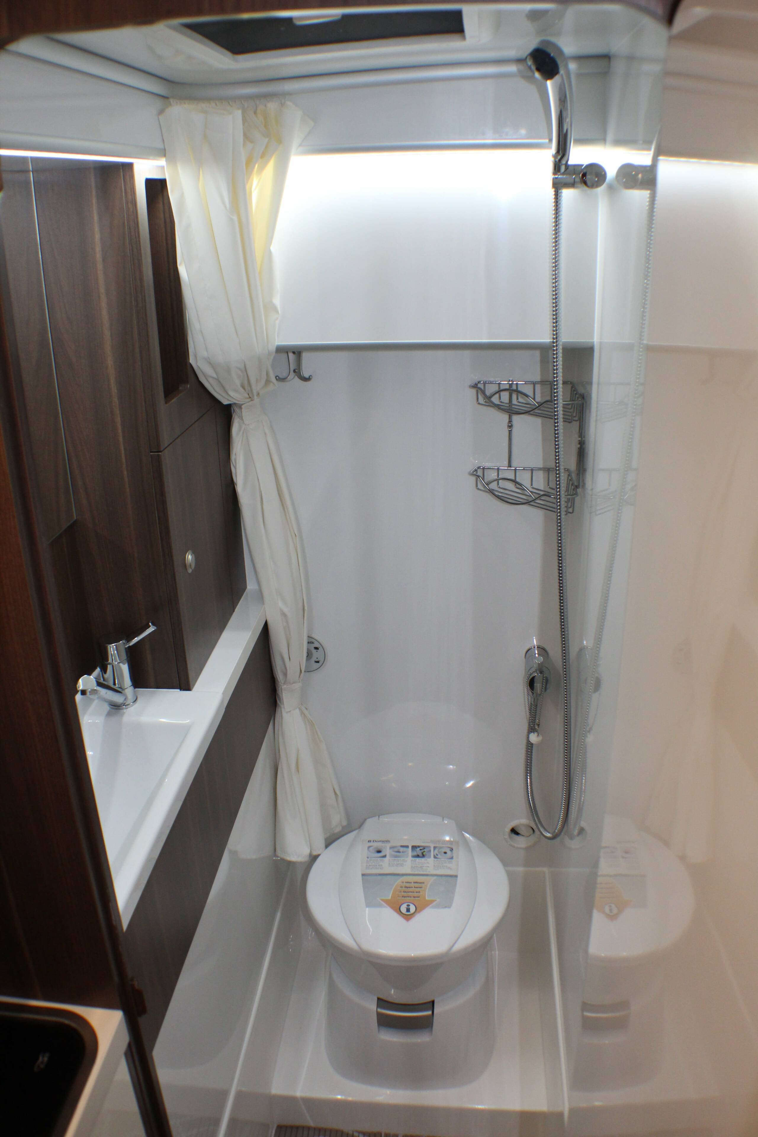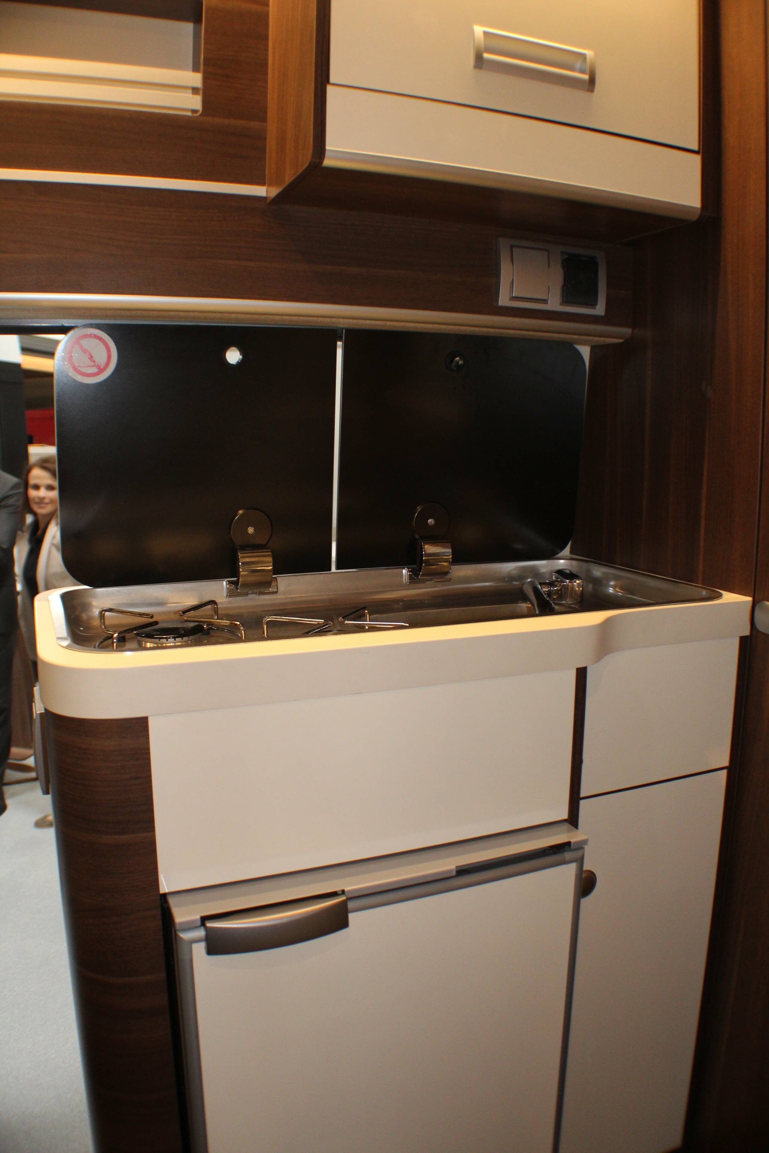 Auf dem Boden findet ein weiteres Crewmitglied auf einer Matratze unter der umgelegten Sitzbank liegend seinen Schlafplatz. Gegenüber bauen die Elcamp-Konstrukteure eine kompakte Küchenzeile ein. Nach hinten hin schließt sich ein schmales Bad mit Kassettentoilette, Waschtisch und integrierter Duschtasse an.