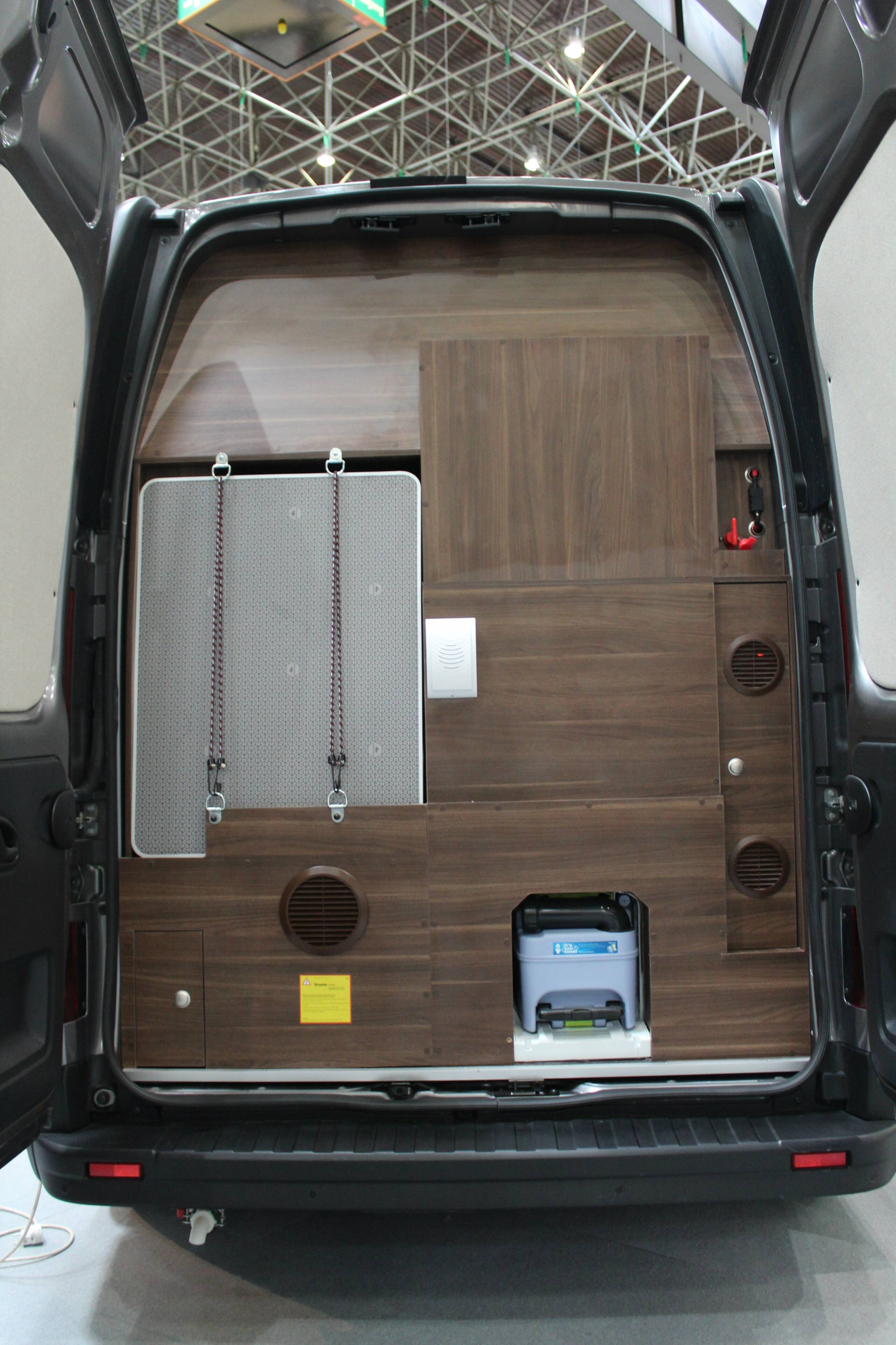 Bei geöffneten Hecktüren kommt der Camper an den gut arretierten Campingtisch und an die Toilettenkassette heran.