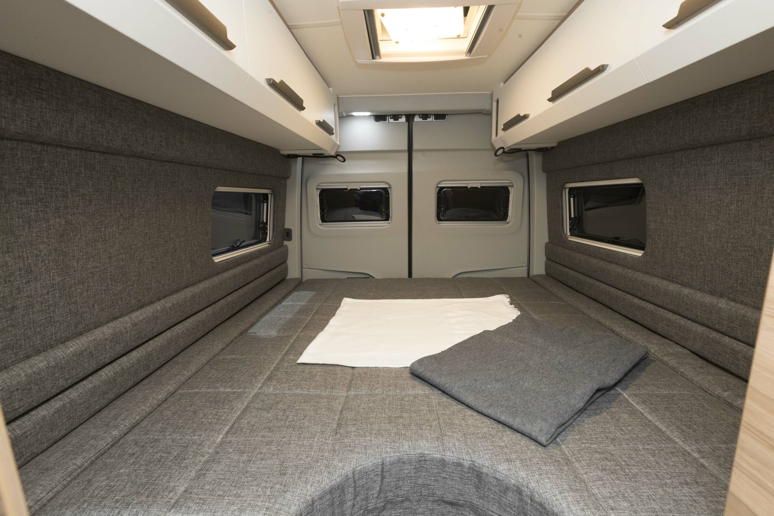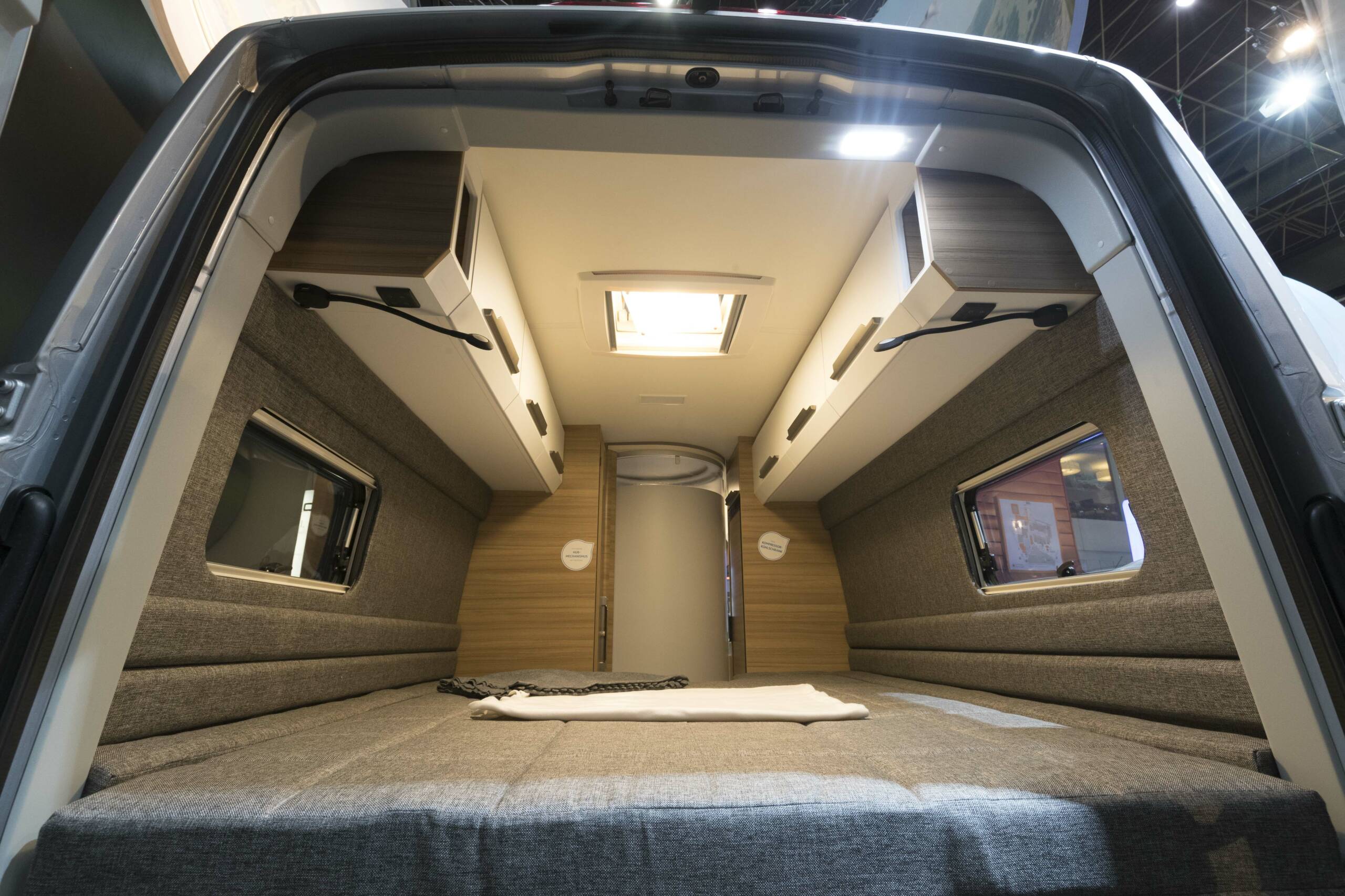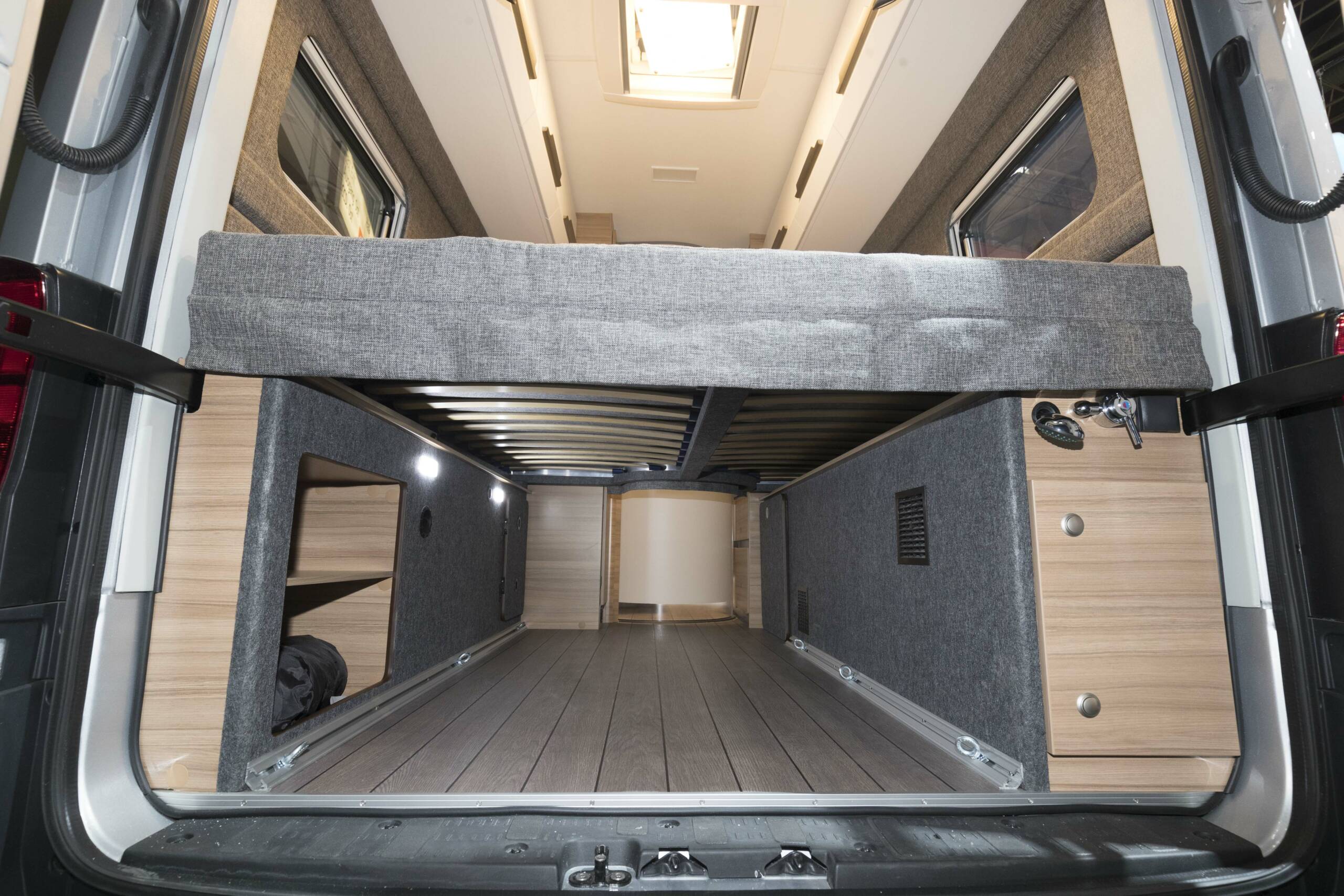 Knaus bietet mit dem Boxdrive First Edition, ausgelegt für zwei bis drei Urlauber, einen ausgebauten Kastenwagen auf Basis des großen Volkswagens an. Nicht gerade kurz mit 6,84 Metern Länge, dafür bietet der Kastenwagen aber ein großes Längsbett mit 2,12 Metern Länge an längster Stelle. Das Bett des 3,5 Tonners wird im Heck über Scheren hochgeklappt. Es kann im hochgeklapptem Zustand oben geschlafen werden, wenn Fahrräder oder viel Gepäck mit an Bord sind.