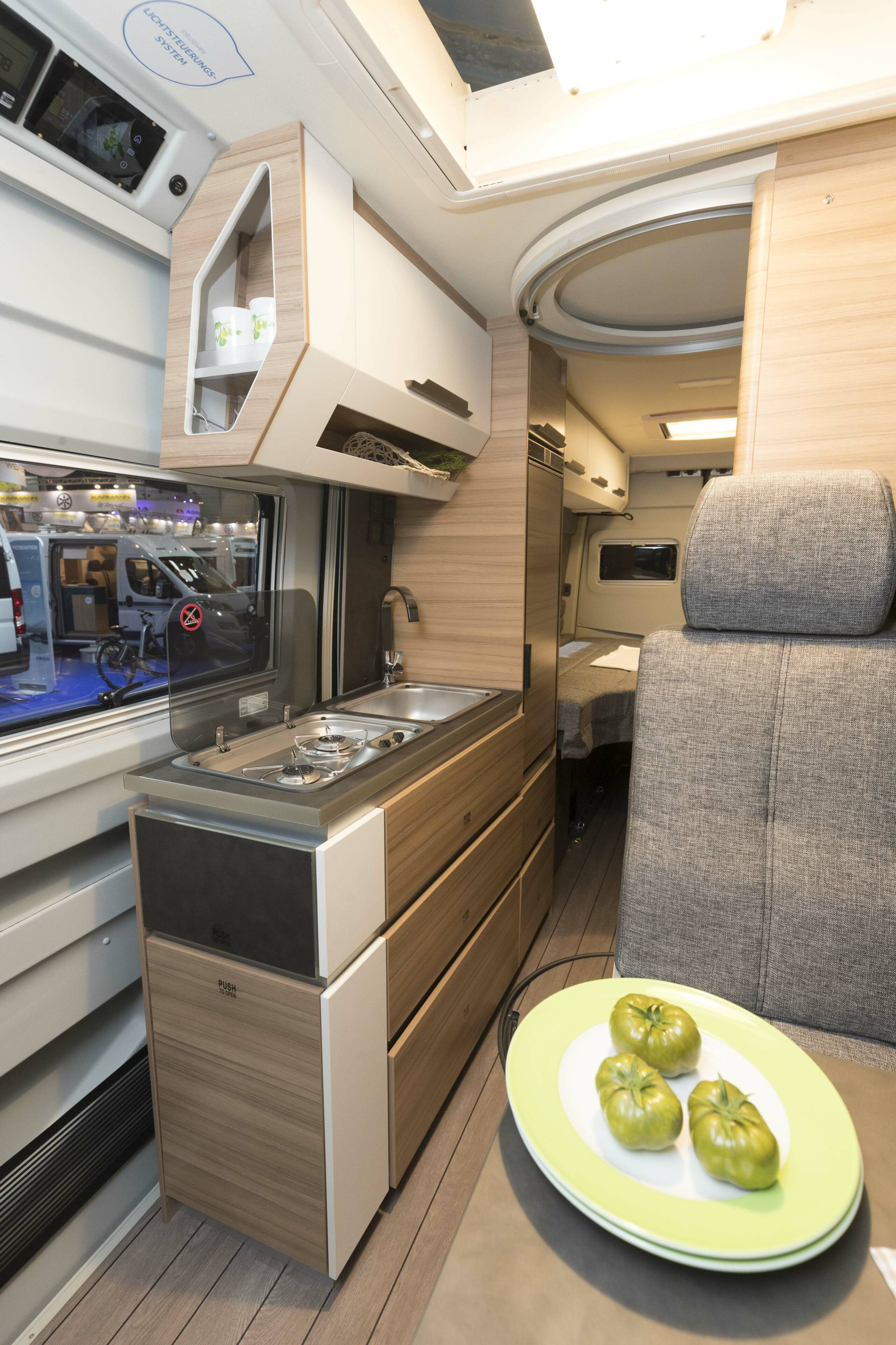 Den nur 172 Zentimeter breiten Innenraum nutzen die Jandelsbrunner außerdem für ein variables Raumbad, das durch eine Schiebetür zum Küchenblock abschließt. Davor befindte sich eine Halbdinette. Modern und ohne Pushlocks kommt der Möbelbau im Küchenblock & Co. aus.