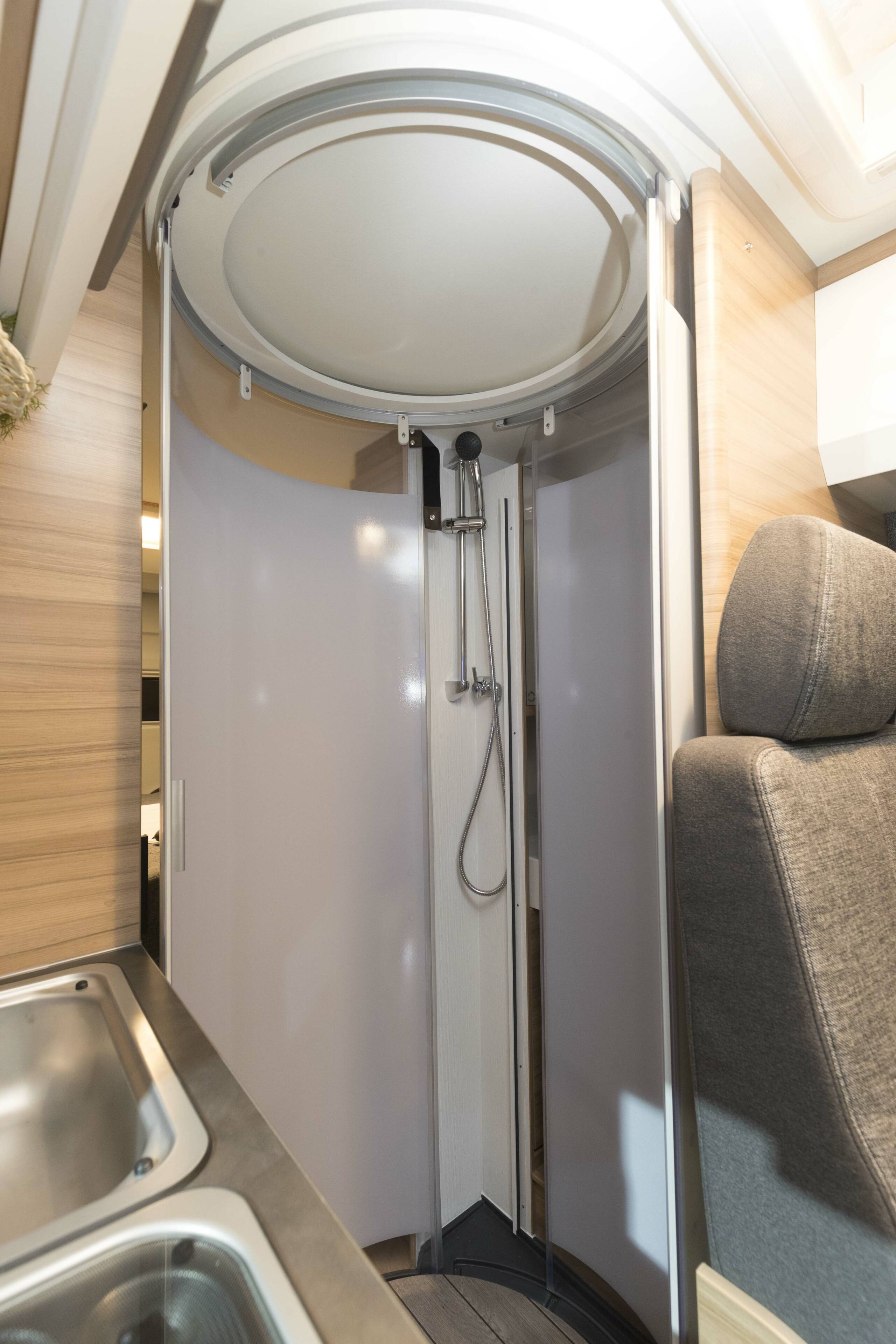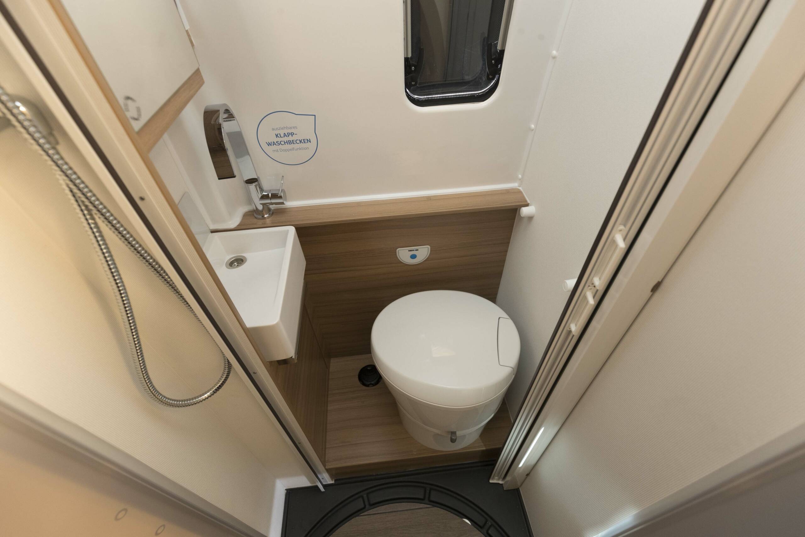 Gute Idee im Bad: Je nachdem, wie weit der Urlauber das Waschbecken herauszieht, steht es als Handwaschbecken oder als übers WC reichender Waschtisch bereit. Wer sich für den von Knaus auch Caravaning Utility Vehicle, kurz CUV, genannten Boxdrive First Edition interessiert, sollte sich sputen: Von der ersten Serie wird der Hersteller nur 150 Stück produzieren.