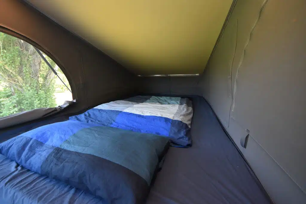 Im mehr als zwei Meter langen und 132 Zentimeter breiten Dachbett übernachten auch zwei Urlauber recht bequem. Die Matratze ist mit fünf Zentimetern zwar dünn, aber sehr fest, sodass man nicht durchliegt. Zwei LED-Spots in der mit Kunstleder verkleideten Decke erhellen das Obergeschoss wirkungsvoll.
