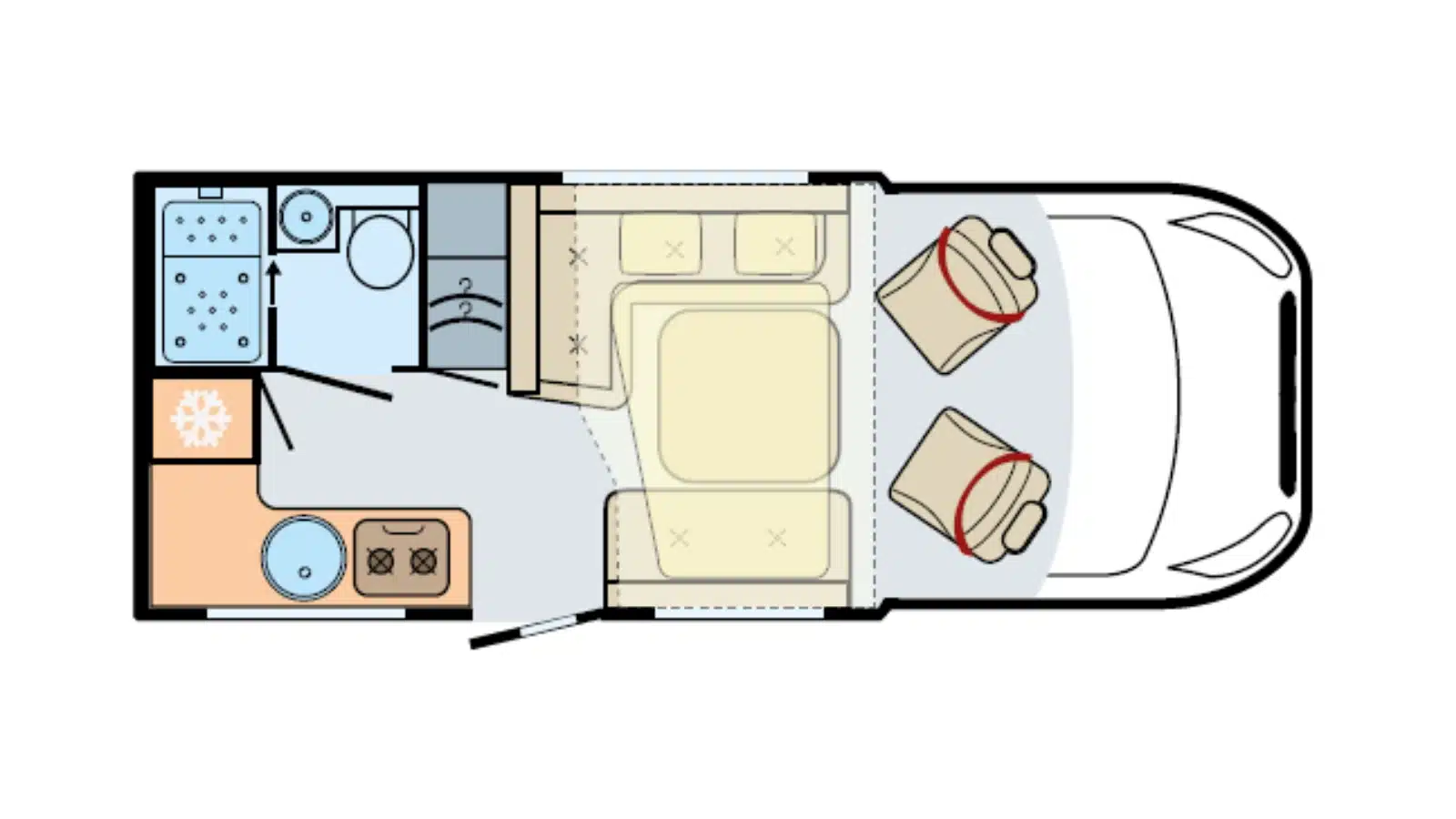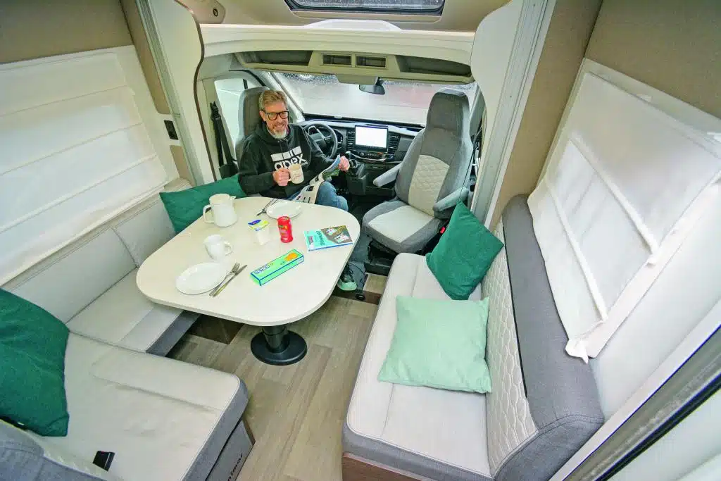 Ein paar gewöhnungsbedürftige Details: Die Stufe zum Badezimmer ist mit 20 Zentimeter recht hoch; die Handbrause lässt sich nur senkrecht in der Halterung fixieren; die Bedieneinheit für die Warmwasserbereitung ist unglücklich platziert, tief hinter dem Fahrersitz; das Hochziehen des Frontrollos ist etwas fummelig. Die hellen Bezüge der Vordersitze schließlich machen einen sehr schmutzempfindlichen Eindruck, zudem warfen sie in unserem Testfahrzeug bereits unschöne Falten.