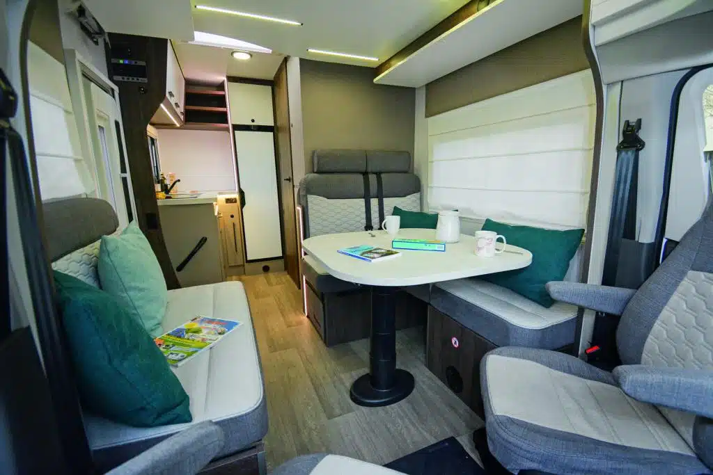 Um es vorwegzunehmen: Auch der 481er erfreut mit einem äußerst wohnlichen Innenraum mit genügend Platz, um sich dort gerne mal längere Zeit aufzuhalten, etwa an einem verregneten Urlaubstag. Geblieben ist die großzügig bemessene und zur Liegefläche umbaubare Sitzgruppe im vorderen Fahrzeugteil. Auch das darüber befindliche elektrische Hubbett ist weiterhin an Bord.