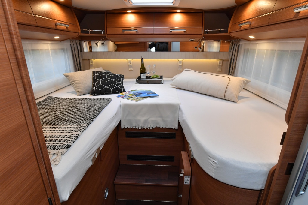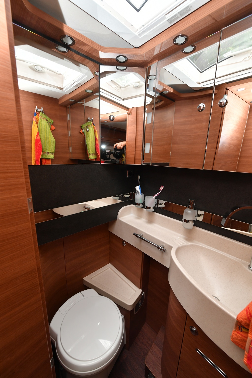 Reichlich Fächer sieht Carthago im Raumbad unter und über dem großen Waschtisch vor. Wer beim Nutzen des WCs die Tür direkt davor schließt und nicht das ganze Raumbad nutzt, dem wird es recht eng. Großzügiger geht es dann im Bett zu. Ein Auszug verbindet die beiden bequemen, knapp 90 Zentimeter breiten Längsbetten zu einer üppigen Spielwiese. So passt jetzt alles zusammen. Zum Wohnkomfort beschert der Sprinter-Triebkopf adäquaten Fahrkomfort.