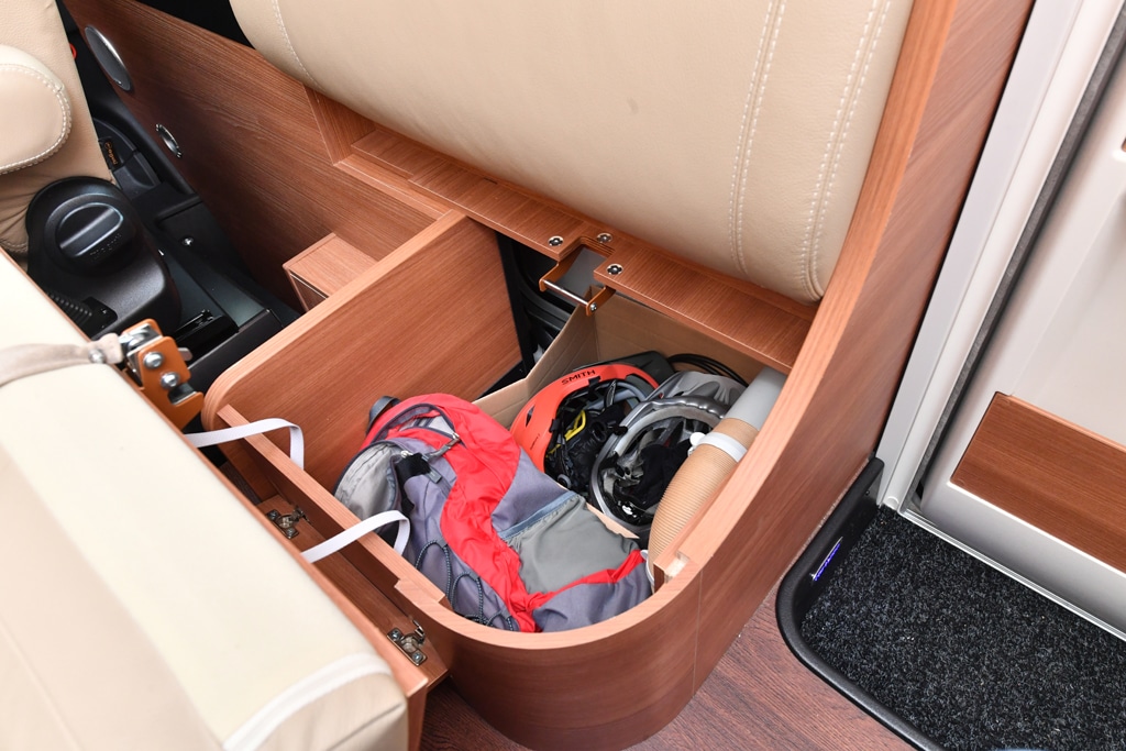 Die große Aufbautür ist doppelt verriegelt: ein weiterer Pluspunkt. Stauraum gibt es reichlich, einen großen Teil dazu trägt der über Klappen mit innen liegenden Scharnieren von außen und innen zugängliche Doppelboden bei. Sogar in der Sitzbank findet sich ein Auszug für Schuhe, was zeigt, dass jeder Winkel genutzt wird. Solide, mehrfach unterteilte Schubladen mit Selbsteinzug in der Küche, neben dem Kühlschrank ein Apothekerauszug und große Oberschränke lassen kaum Wünsche offen, zumal auch noch die eingezogene Arbeitsplatte für Bewegungsfreiheit sorgt.