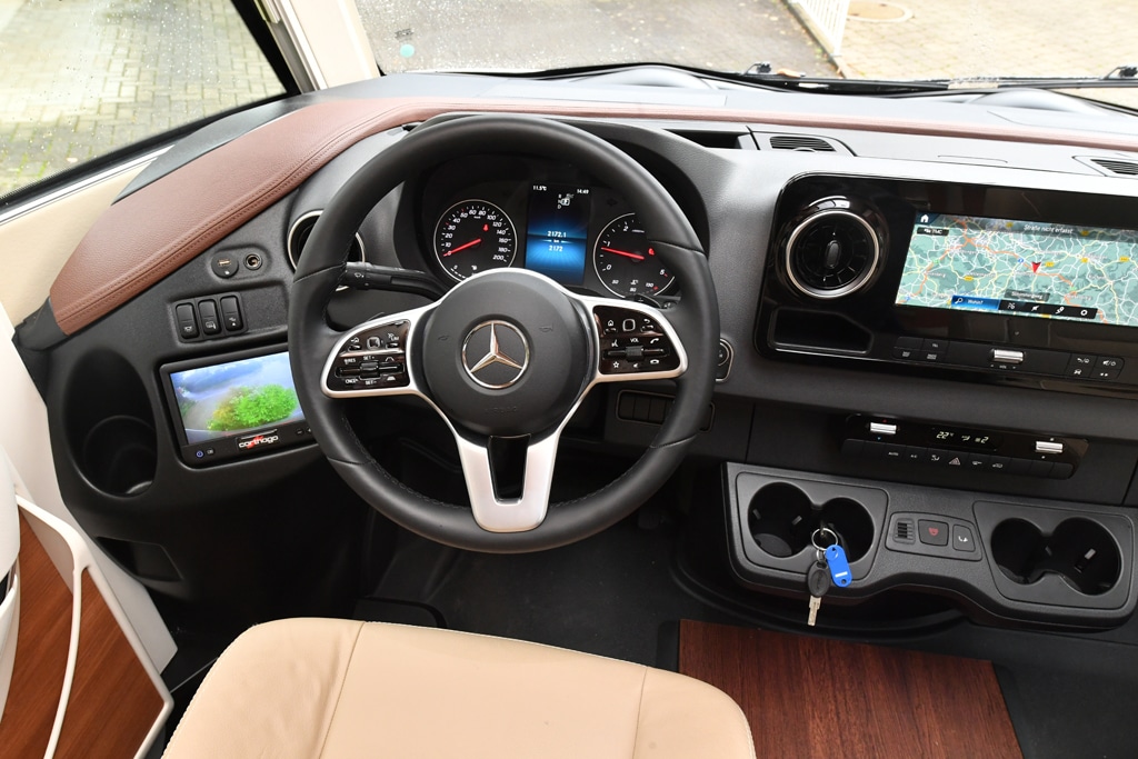 Dazu gehören dann der 177 PS starke Turbodiesel-Motor, das Neungang-Automatikgetriebe, das schon aus optischen Gründen unverzichtbare MBUX-Infotainment und Multimediasystem von Mercedes, das Mercedes-Fahrassistenzpaket, eine Lederausstattung, 32-Zoll-Bildschirm und das Carthago- Super-Paket für 7.950 Euro, das mit reichlich sinnvollen Extras (etwa von der Mercedes-Fahrerhaus-Klimaanlage über den Tempomat, verstärkte Vorderachse, großem Kraftstofftank, Lederlenkrad mit Multifunktionstasten, Regensensor und vielem mehr) aufwartet und auf das nicht verzichtet werden sollte. Carthago gibt hier eine Ersparnis von 3.000 Euro an.