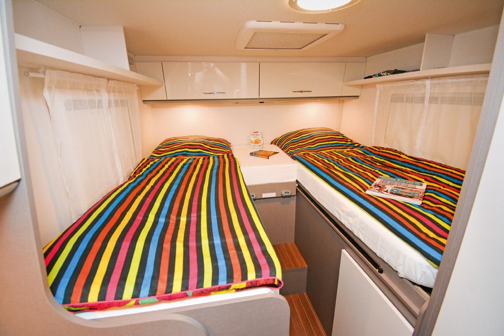 Die Matratzen der Einzelbetten ruhen auf Holzlattenrosten und in den Bettfußenden befindet sich je ein Wäscheschrank. Zum Erweitern der Betten zum Doppelbett zieht der Urlauber eine Holzlade zu sich und belegt sie mit einem Zusatzpolster. Im Bad entsteht die integrierte Duschkabine durch Schwenken des Waschbeckens samt Spiegelwand vor die drehbare Toilette.