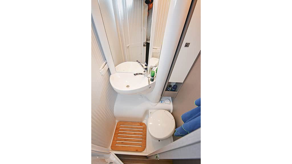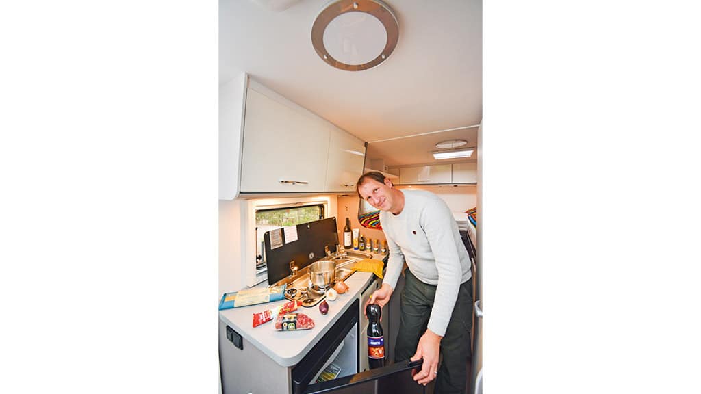 Das Warmwasser liefert eine Gasheizung Truma Combi 4 und bezieht das Nass aus dem frostsicher installierten 110-Liter-Frischwassertank. Der klassisch konzipierte Küchenblock beherbergt in seinem Unterschrank einen 78-Liter-Absorberkühlschrank.