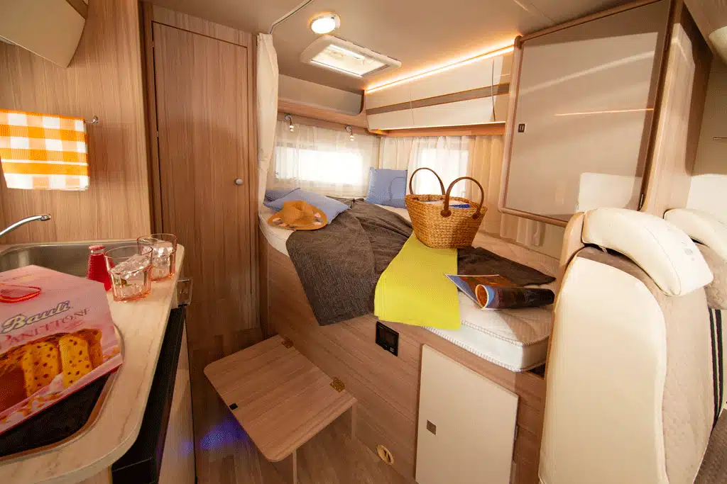 Dominiert wird der Innenraum vom Längsbett. Es ist mit 2,30 Meter sehr lang geraten – zu lang, denn das Raumangebot der Sitzgruppe leidet darunter merklich. Typisch für einen Grundriss mit seitlichem Bett ist dessen recht geringe Breite von 1,30 Meter. Mitunter freut sich der zweite Reisende da über das elektrisch bedienbare Einzelhubbett (1.190 Euro) über der Sitzgruppe, das ebenso wie das Heckbett mit einer bequemen Matratze auf einem Lattenrost aufwartet.