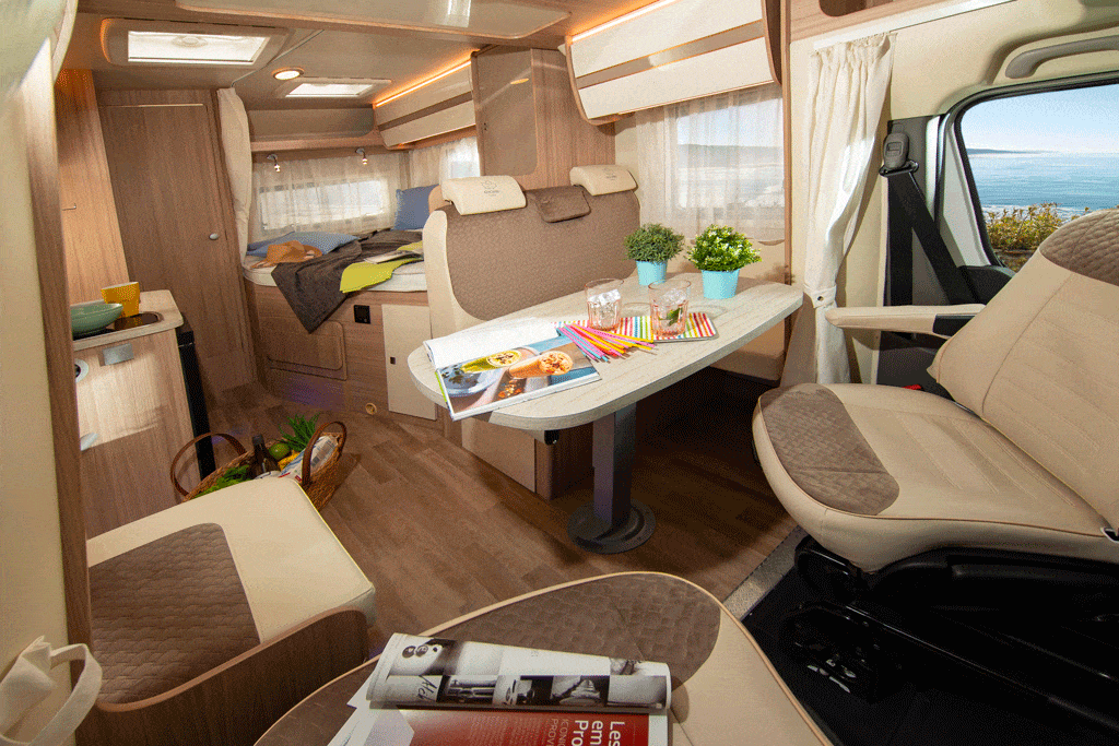 Für den Profitest fällt die Wahl auf einen Ahorn Camp T 590. Der Teilintegrierte ist mit 5,99 Meter Länge das kürzeste Fahrzeug im Programm. Der Grundriss: Ein Längsdoppelbett neben dem Bad im Heck, auf der Beifahrerseite ein kompakter Küchenblock und vorn eine Halbdinette mit drehbaren Fahrerhaussitzen. Das Testfahrzeug war mit dem optionalen Hubbett über der Sitzgruppe ausgestattet und trägt deshalb den Namenszusatz „Plus“. Zusammen mit der umbaubaren Sitzgruppe können bis zu vier Camper im Ahorn auf Tour gehen. Preis: Ab 41.800 Euro.