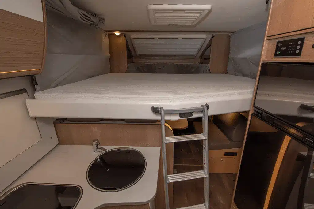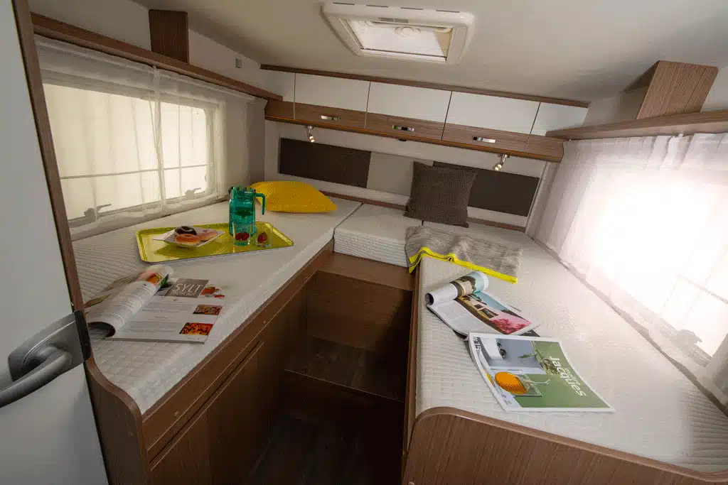 In diese Kategorie fällt auch der große Carado T447 für einen Grundpreis von 45.999 Euro. Auf ganze 7,40 Meter streckt sich der Teilintegrierte auf Fiat Ducato Tiefrahmenchassis. Zu den bequemen und auch für groß gewachsene Camper ausreichend langen Einzelbetten über der Garage im Heck gesellt sich im Testfahrzeug ein Hubbett über der Sitzgruppe (1469 Euro Aufpreis). Manuell nach unten gezogen, bietet es zwei weitere Schlafplätze.