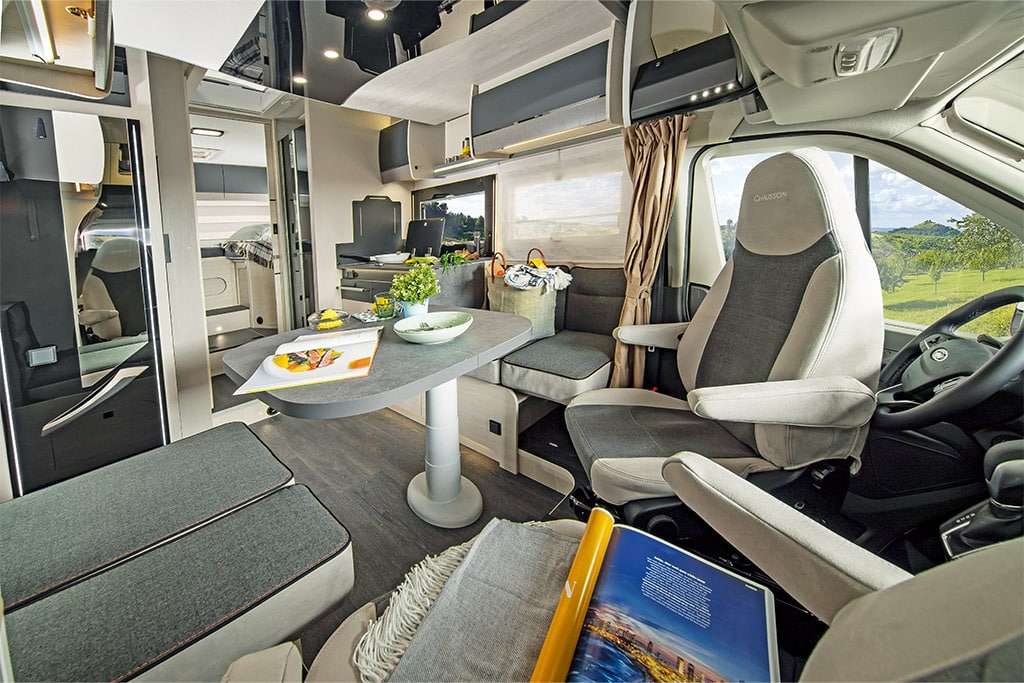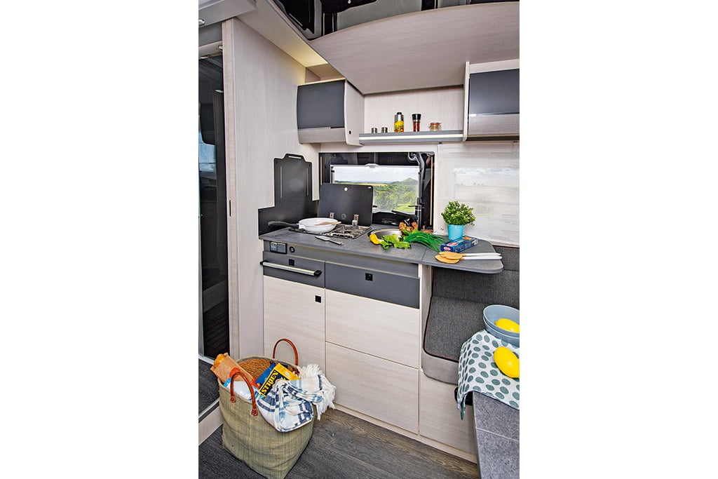 Die Küche glänzt mit großer, gut nutzbarer Arbeitsfläche, die sich mit einem Klappbrett über der fahrerseitigen Sitzbank zudem bündig erweitern lässt. Der trivalente (230 V712 V/Gas) Absorberkühlschrank fasst 142 Liter. Der Zweiflammkocher von Can zündet elektrisch. Nicht allzu üppig: der Stauraum in der Küche. Die geräumige Sitzgruppe formiert sich aus den dreh- und höhenverstellbaren Vordersitzen, dem mittig angeordneten Tisch mit dreh-, verschieb-, absenkbarer und hälftig umlegbarer Tischplatte sowie den zwei an den Seitenwänden einander gegenüber platzierten Sitzbänken, aus denen mit wenigen Handgriffen jeweils ein Klappsitz in Fahrtrichtung mit Kopfstütze und Dreipunkt-Sicherheitsgurt entsteht.