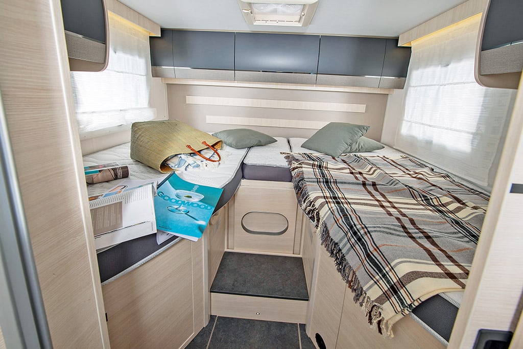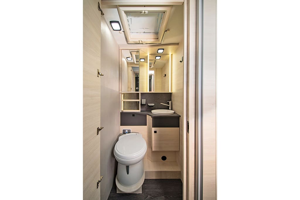 Doch der der Franzose bietet noch mehr: Dach, Wände und Boden entstehen aus GfK-Sandwich und die Isolierung besteht aus wasserabweisendem XPS. Rahmenfenster sind ebenso Serie wie die doppelte Verriegelung mit Zentralverriegelung sowie das Fenster in der Aufbautür. Zudem ist der der Aufbau sorgfältig verarbeitet. Innen lassen sich die die beiden 190 und 201 Zentimeter langen Betten zu einem Doppelbett erweitern. Eine Öffnung im senkrechten Aufstellbrett dieser Konstruktion erübrigt hier eine Einhängeleiter. Beide Holzlattenroste lassen sich von Gasdruckdämpfern unterstützt aufstellen, darunter kommen je ein Kleiderschrank und offene Fächer zum Vorschein. Das Raumbad übernimmt den Einrichtungsstil des übrigen Innenraums. Die beiden Acrylglastüren der separaten Dusche lassen sich einfach bedienen, sind aber recht labil. Die Drehtoilette montiert der Hersteller auf einen kleinen Sockel. Das Waschbecken ist ausreichend bemessen.