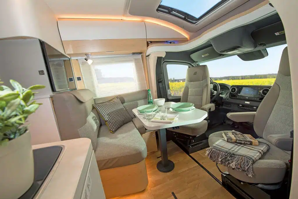 Innen weist der Hymer B-MC 580 T einen üblichen Grundriss auf: Zwei längs eingebaute Betten über der Heckgarage, ein Bad mit integrierter Dusche und ein Küchenblock neben der Aufbautür. Im Bug befindet sich die Halbdinette mit optionaler L-Sitzbank, dem zentralen Tisch und den drehbaren Fahrerhaussitzen.