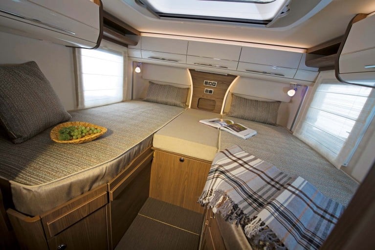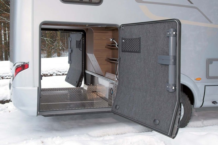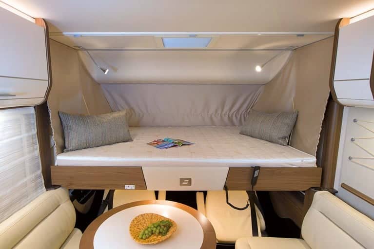 Ein – auf Wunsch elektrisch angetriebenes – Hubbett sowie zwei Dreipunktgurte und Kopfstützen an der Sitzbank machen den Hymer B-SL 704 zum vollwertigen, voll wintertauglichen Vier-Personen-Mobil – Frisch- und Abwassertank befinden sich frostgeschützt im isolierten, beheizten Doppelboden. Optional baut Hymer statt der Truma-Combi-6-Luftheizung eine Warmwasserheizung von Alde ein. Die zulässige Gesamtmasse des Hymer B-SL 704 beträgt stets 4.500 Kilogramm, der Grundpreis 95.990 Euro.