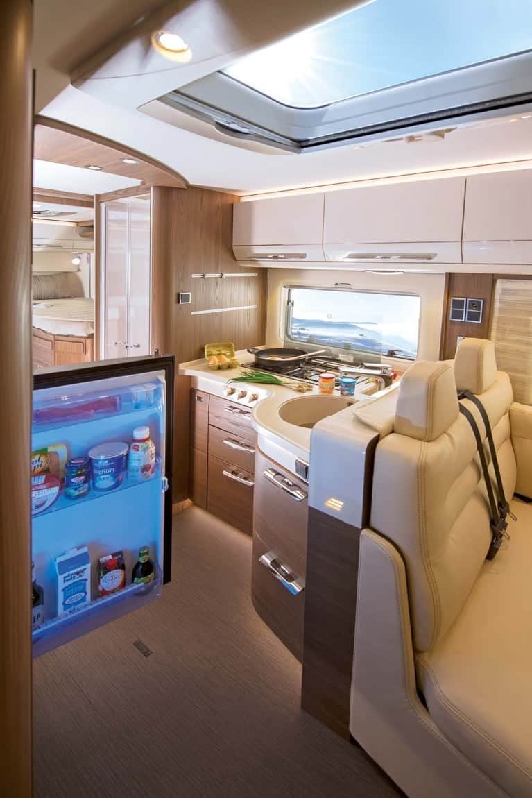 Zum Profitest tritt der neue Hymer B-SL 704 an, ein 7,79 Meter langer Integrierter auf Fiat Ducato 40H mit großer zweitüriger Heckgarage mit selbsttragendem Boden und Einzelbetten darüber. Vorm Raumbad installiert Hymer die Winkelküche mit separat stehendem 160-Liter-Kühlschrank und davor die Sitzgruppe mit L-Sitzbank, Seitensitz, den drehbaren Pilotensitzen und einem zentralen Tisch, dessen Tischplattenhälften in sich in einer aufpreispflichtigen Version auseinanderschieben und durch ein Mittelteil ergänzen lassen.