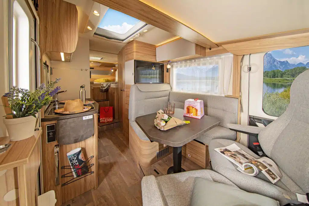 Über der Sitzgruppe hängt das manuelle Hubbett mit 184 mal 150 Zentimeter großer Matratze, dass sich abgesenkt auf zwei Simsen abstützt und somit wackelfrei ist. Die umfangreiche Serienausstattung beinhaltet unter anderem Rahmenfenster, Panorama-Dachfenster, zwei Garagentüren, Fenster in der Aufbautür, Fahrertür, Markise, Alufelgen, Erweiterung der Einzelbetten zum Doppelbett, LED-Ambientebeleuchtung, Radioanlage, Satellitenanlage mit 32-Zoll-Fernseher, Rückfahrkamera sowie einen Gasregler mit Crashsensor, der den Betrieb der Gas-Luft-Heizung Truma Combi 6 CP plus während der Fahrt erlaubt. Der 120-Liter-Frischwassertank sowie der 90-Liter-Abwassertank sind isoliert und beheizt.
