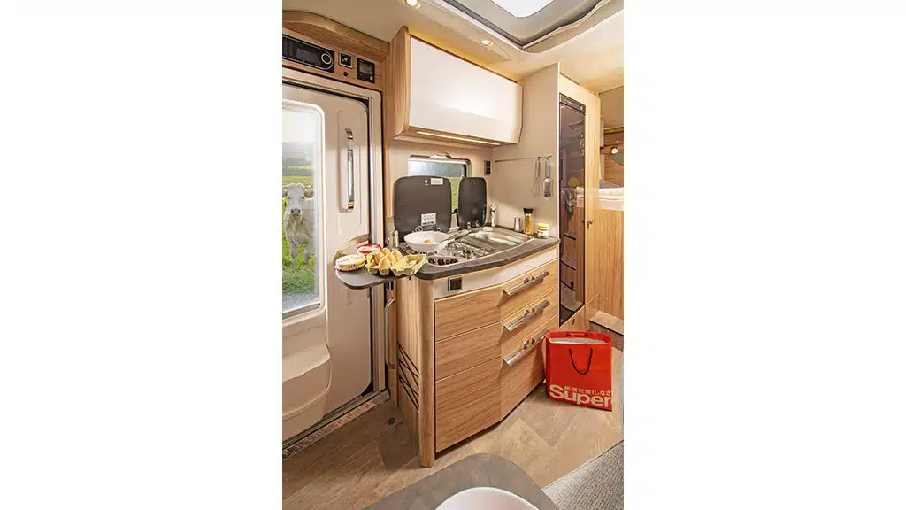 Der Küchenblock mit nebenstehendem 142-Liter-Absorberkühlschrank ist mit elektrisch zündendem Dreiflammherd, Rechteckspüle, guter Beleuchtung und einer oberflächenbündigen Erweiterung der Arbeitsplatte ausgestattet. Der Stauraum in Ober- und Unterschrank reicht für vier Reisende gut aus. Die bequeme Sitzgruppe formiert sich aus einer Zweier-Sitzbank mit L-Schenkel den drehbaren Vordersitzen und einem Tisch mit dreh-, verschieb- und absenkbarer Tischplatte.
