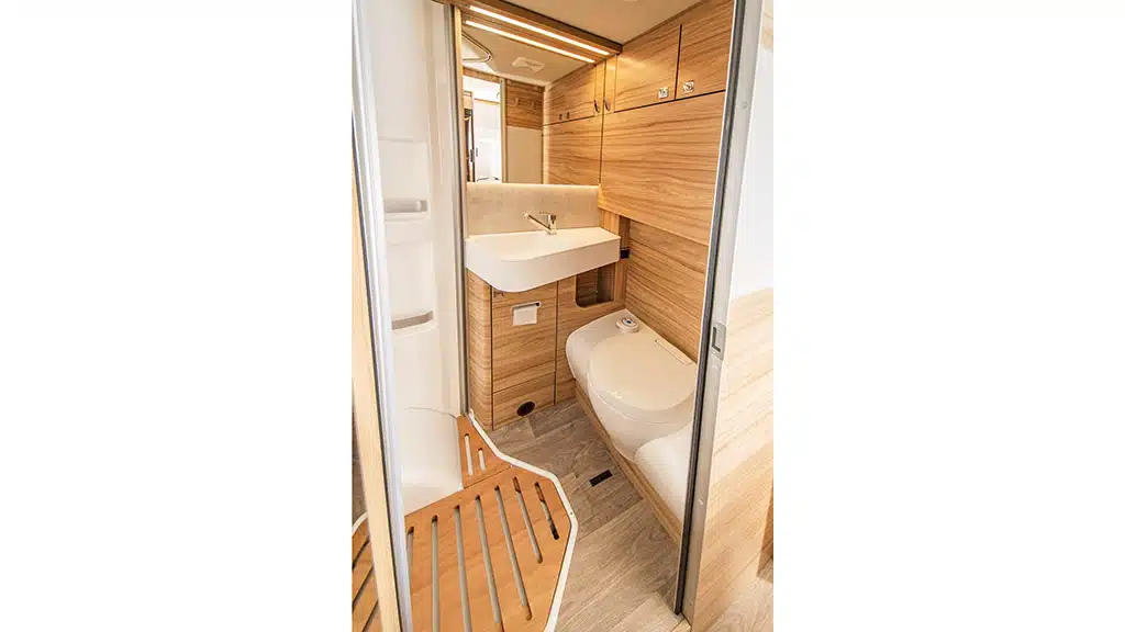 Vor den 198/193 und 195/188 Zentimeter langen Einzelbetten mit Kleiderschränken in den Fußenden installiert der Hersteller aus dem oberschwäbischen Bad Waldsee ein Bad mit integrierter Dusche, Banktoilette, ausreichend großem Waschbecken und Badschrank.