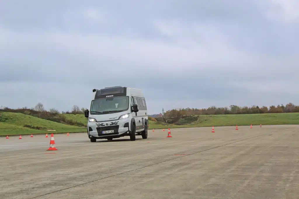 Der Knaus BoxTime 630 ME rollt mit optionalem Heavy-Duty-Chassis auf das Testgelände. Bis an die von Knaus freigegebene zulässige Gesamtmasse von 4.000 Kilogramm beladen, durchfährt der 6,36 Meter lange Kastenwagen den doppelten Spurwechsel mit flotten 60 km/h und benötigt für den 18-Meter-Slalom 13,0 Sekunden. Beide Werte sind besser als der Durchschnitt. Dank des straffen und sicheren Fahrwerks greift das ESP recht spät ein und ermöglicht so die hohen Kurvengeschwindigkeiten.