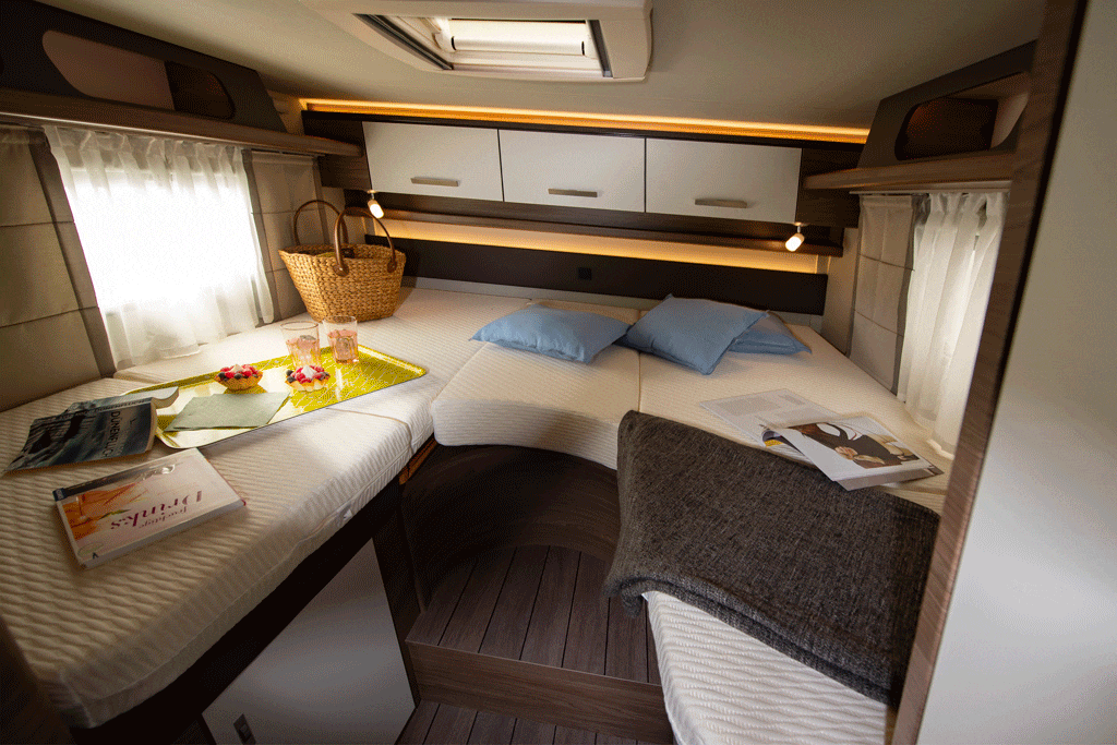 Überm Fahrerabteil ist das manuelle Hubbett mit 191 x 150 Zentimeter großer Matratze montiert. Urlauber erreichen es ohne Leiter über den Seitensitz der Sitzgruppe.