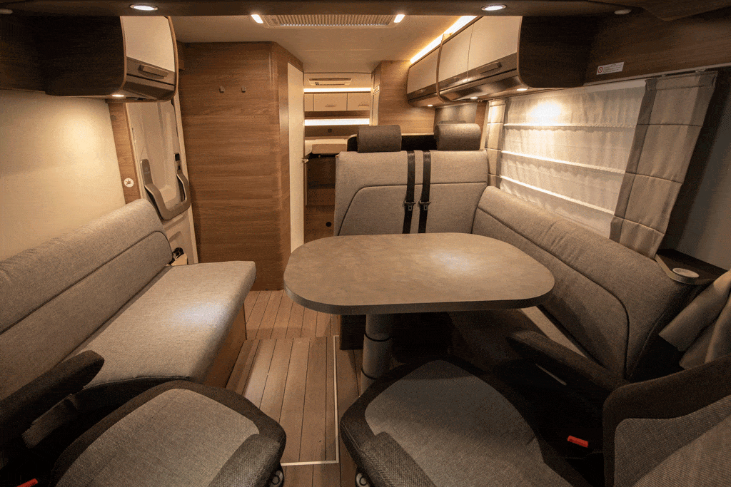 Das Testfahrzeug ist als Extra mit einer L-Sitzbank und einem Tisch mit Zentralfuß ausgestattet. Serienmäßig baut Knaus eine Zweiersitzbank und einen an der Seitenwand angeschlagenen Tisch ein.