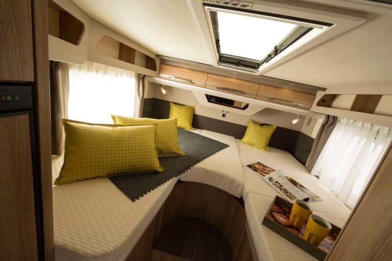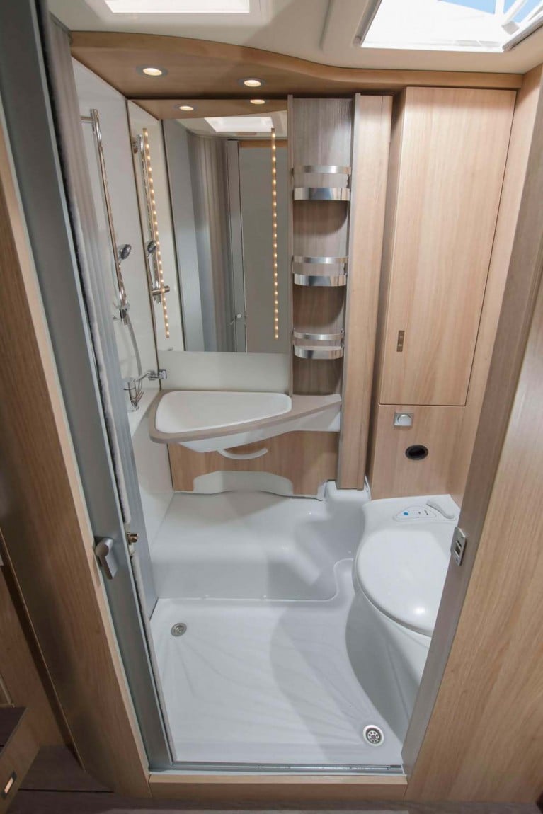 Die Einzelbetten sind 200 und 198 Zentimeter lang. Die Sitzgruppe im Bug bietet genügend Platz für gemütliche Abende. Möglich macht Knaus dies durch das kompakte und variabel gestaltete Bad. Zum Duschen schwenkt der Urlauber das Waschbecken samt Wand dahinter vor die Banktoilette und zieht die Bad-Gliedertür hinter sich zu – schon entsteht eine geräumige, gut nutzbare Duschkabine.