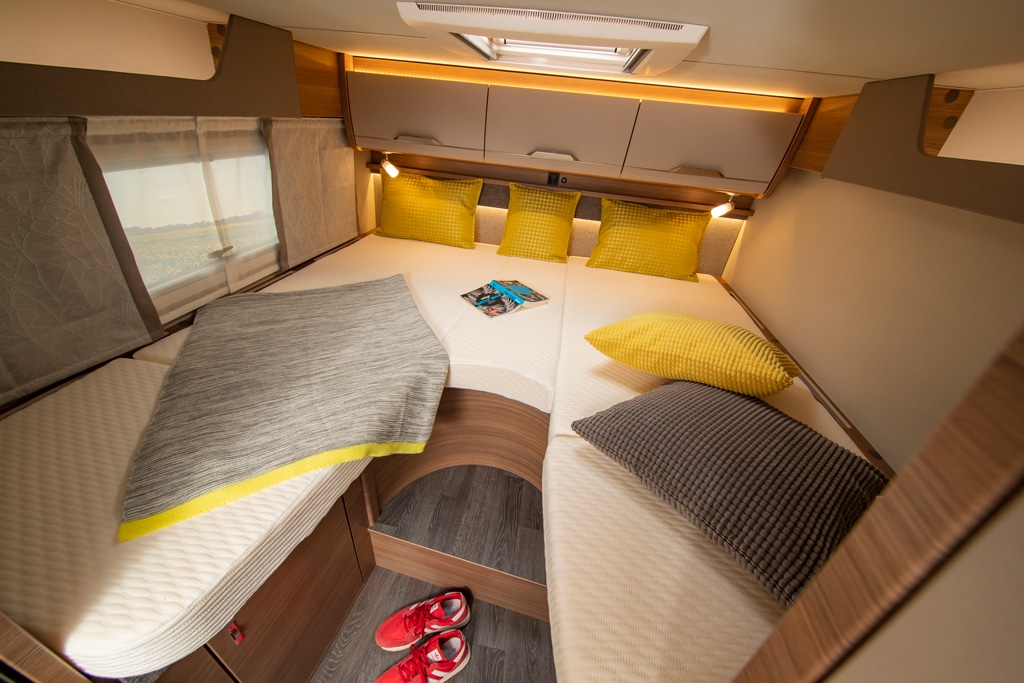 Der Grundriss scheint zunächst ganz klassisch: Über der Heckgarage zwei Einzelbetten in Längsrichtung, davor ein kompakter Küchenblock und gegenüber ein Bad mit integrierter Dusche, vorn L-Sitzgruppe mit drehbaren Vordersitzen und darüber wie üblich bei Integrierten ein Hubbett. Wer genauer hinschaut und den Vergleich zum bisheringen Van I 650 MEG zieht, merkt aber schnell, dass Knaus einige Punkte optimiert hat.