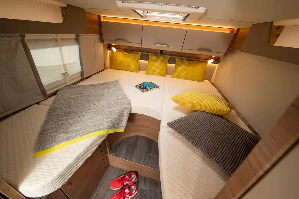 So erreichen nun beide Einzelbetten eine Länge von zwei Metern, auch großgewachsene Camper können sich hier ausstrecken. Die beiden Kleiderschränke unter den Fußenden der Betten sind komfortabel über aufklappbare Deckel auch von oben zu erreichen. Zudem hat Knaus einen weiteren, zwar schmalen aber dafür raumhohen Kleiderschrank zwischen linkem Bett und Bad eingebaut.