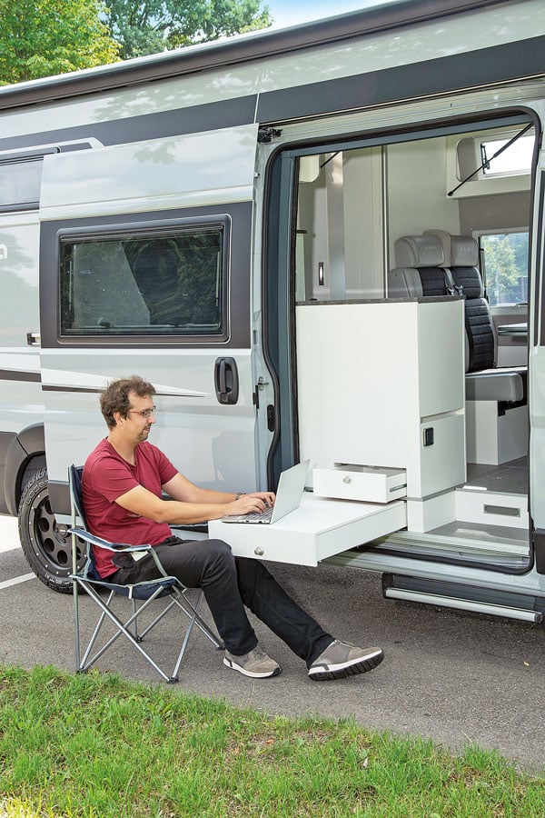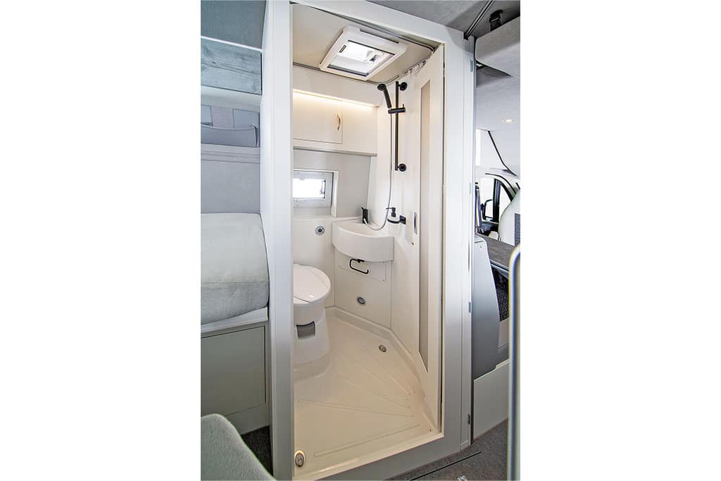 Gegenüber der Küche befindet sich jenseits des Mittelgangs das Bad mit Drehtoilette von Dometic mit Porzellan-Inlay und einem Waschbecken mit ausziehbarer Duschbrause. Zum Duschen zieht der Urlauber einen Duschvorhang um sich herum. Sehr gut: Die gesamte Nasszelle ist äußerst akkurat abgedichtet, und die zweiflügelige Badtür mit Acrylglas-Einsatz öffnet raumsparend nach innen. Empfehlenswert: das optionale, im Testfahrzeug eingebaute Badfenster.