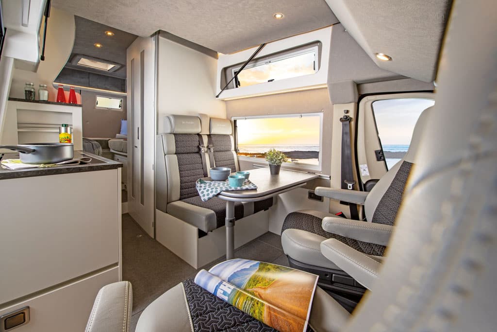 Im Innenraum mit rund 14 Zentimeter aufgedoppeltem Laufboden mit Bodenstaufächern findet der Camper im vorderen Fahrzeugteil die Halbdinette mit an der Seitenwand eingehängtem, vergrößerbarem Tisch, mit den dreh- und höhenverstellbaren Vordersitzen sowie mit der Sitzbank mit zwei Dreipunkt-Sicherheitsgurten und Kopfstützen. Die Sitzfläche der Sitzbank lässt sich ein Stück weit nach vorne ziehen, ihr folgt das untere Ende der Rückenlehne, die dadurch im Neigungswinkel variiert.