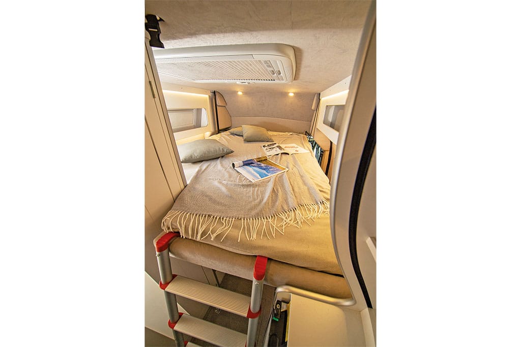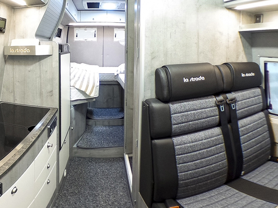 Über der Sitzgruppe montiert La Strada ein 201/180 mal 132 Zentimeter großes Hubbett in Fahrzeug-Längsrichtung für zwei Personen, welche die Liegefläche mit einer Einhängeleiter erreichen. Die Liegefläche mit Matratze auf Federtellern ruht im abgesenkten Zustand wackelfrei auf Möbelsimsen.