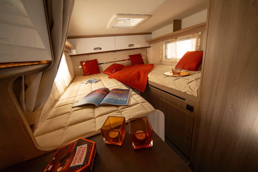 Geschlafen wird in den beiden Einzelbetten im Heck. Auf der linken Seite müssen 1,90 Meter Liegelänge genügen, rechts sind es immerhin 1,95 Meter. Großgewachsene können ihre Füße zudem noch ein paar Zentimeter auf die Ablagefläche über dem Kleiderschrank strecken. Da dieser Schrank nicht raumhoch ausgeführt ist und auch ein ebensolcher Kühlschrank fehlt, ergibt sich auf dem rechten Bett liegend eine freie Blickachse durchs ganze Wohnmobil. Das lässt den Raum großzügig erscheinen.