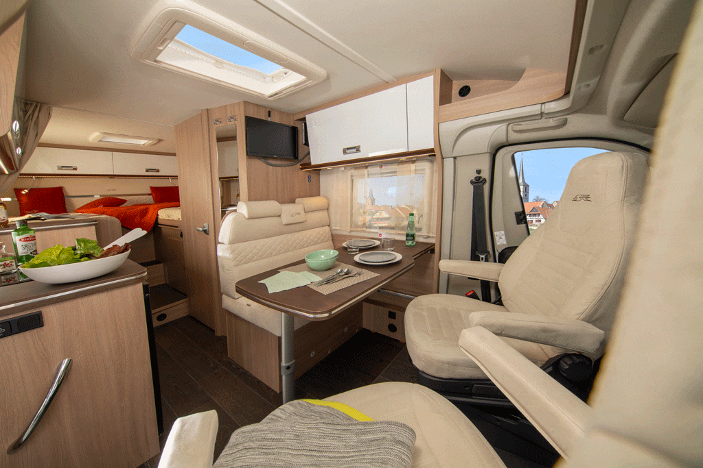 Im Innenraum punktet der Italiener mit einem durchweg eleganten Ausbaustil. Helle Möbeloberflächen, Schrankklappen in Hochglanzweiß sowie ein dunkler Fußboden harmonieren gut. Das Mobiliar ist stabil, allerdings genau wie der Aufbau von einfacher Machart. Trotzdem finden sich schöne Details wie Oberschränke mit Softclose-Technik und gerundeten Schließblechen. Während der Fahrt geht es wegen vernehmlich knarzender Einbauten allerdings nicht gerade leise zu.