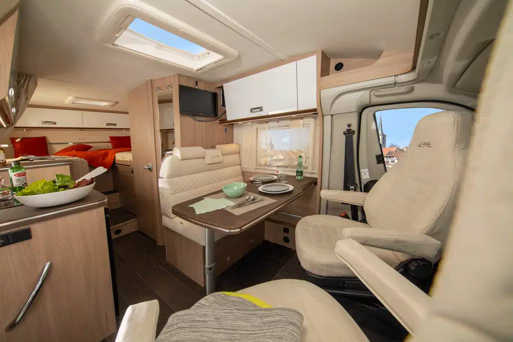 Klassenüblich zeigt sich die Elektrik. LED-Lichtleisten an der Unterkante der Oberschränke illuminieren den Innenraum geschmackvoll. Auch an USB-Steckdosen am Bett und an der Sitzgruppe hat der Hersteller beim Laika Kosmo V9 gedacht.