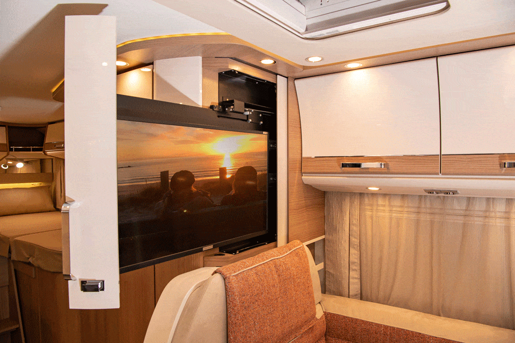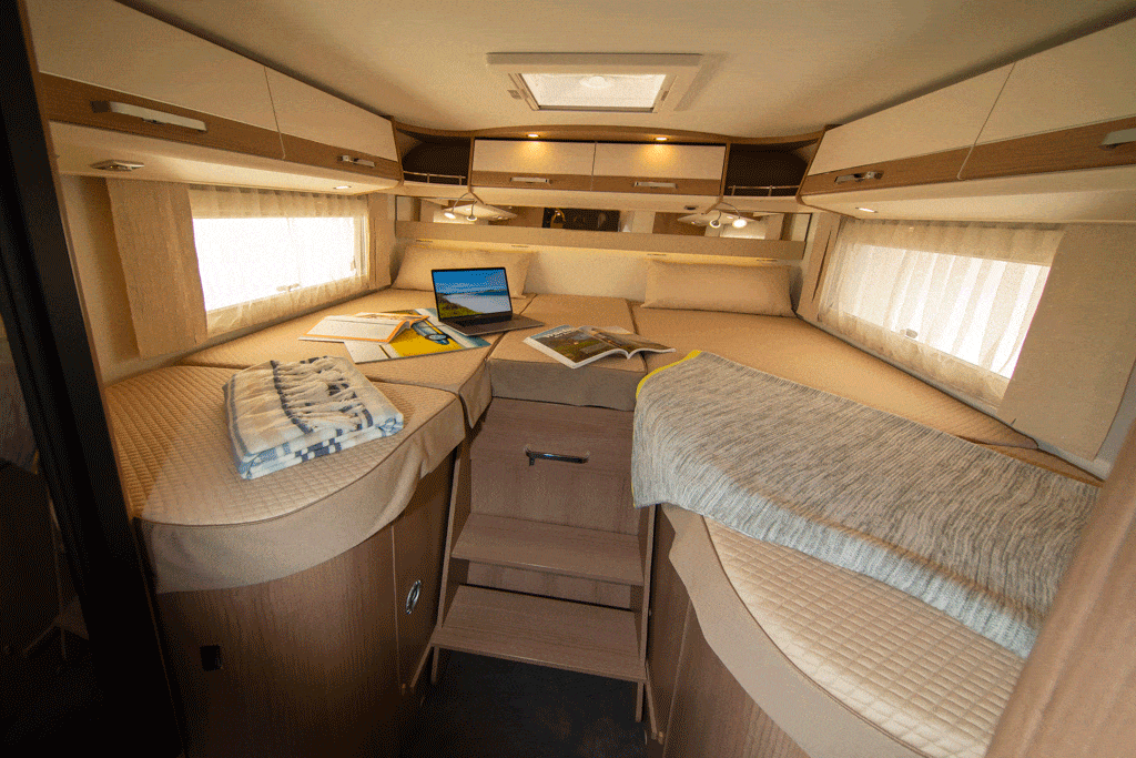 Nach dem Öffnen der Aufbautür erblickt der Reisemobilist sogleich das große Bilgenfach mit Fußbodendeckel, das tief in den beheizten, isolierten und von außen und innen zugänglichen Doppelboden hineinreicht. Das Mobiliar ist nun heller als vorher und nimmt ebenfalls Anleihen aus dem Stamm-Haus in Aulendorf. So findet sich auch im Malibu eine verschiebbare Treppe, die bei der serienmäßigen Erweiterung der Einzelbetten zum Doppelbett eine Einhängeleiter erübrigt. Auch verwendet man in Slowenien die gleichen stabilen Federaufsteller für die konkav geformten Oberschrankklappen.