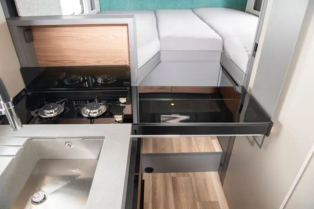 Im Unterschrank installiert Niesmann+Bischoff statt eines Absorber-Kühlschranks einen Kompressor-Kühlauszug mit Eisfach und bestückt ihn mit genormten Gastro-Behältern. Ein elektrisch auf- und abfahrendes Küchenregal dient zusammen mit einer Holzschiebetür gleichzeitig als Abtrennung zum Schlafzimmer.