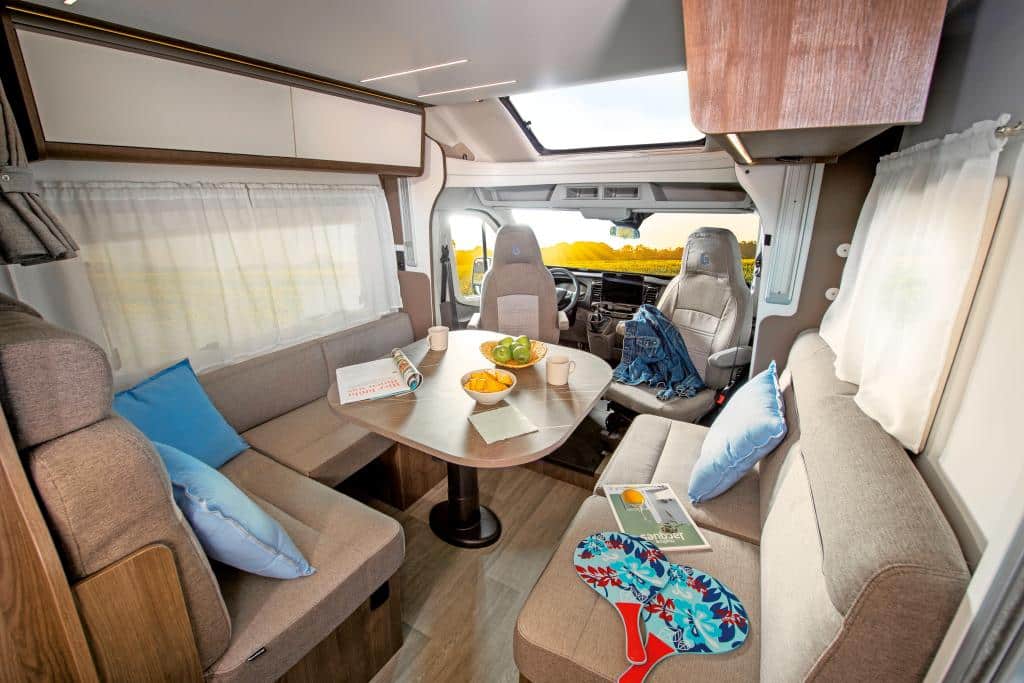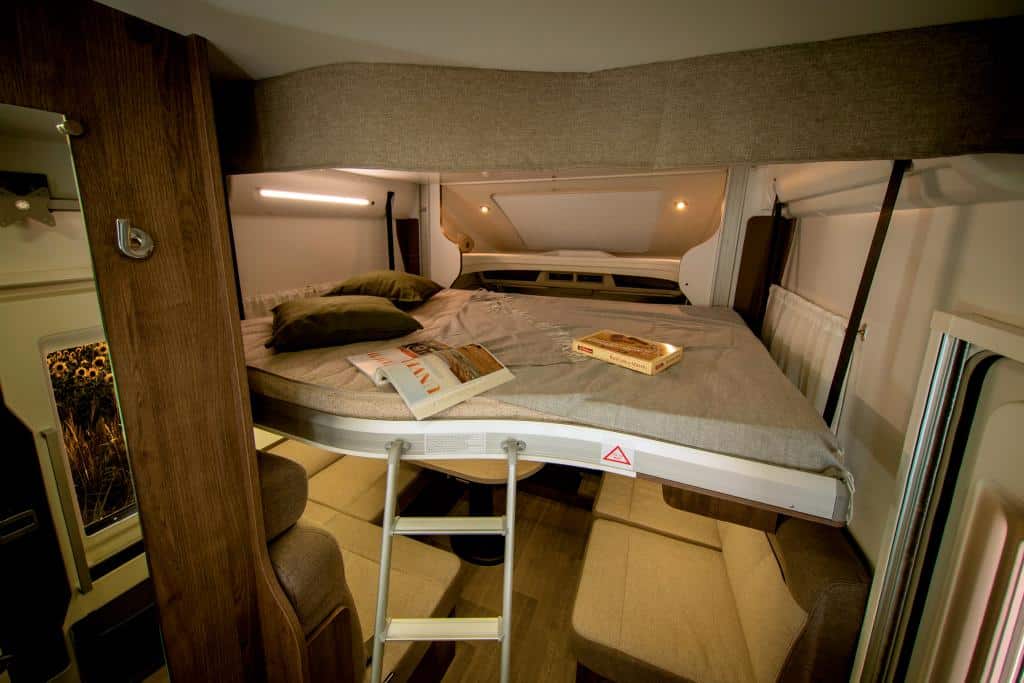 Im vorderen Fahrzeugteil bringt Benimar eine großzügig bemessene und zur Liegefläche umbaubare Sitzgruppe mit elektrisch höhenverstellbarem Tisch unter. Darüber wartet ein elektrisch angetriebenes Hubbett auf seinen Einsatz und über der Heckgarage installiert der spanische Hersteller ein manuell höhenverstellbares Doppel-Querbett. Hinter der Aufbautür bleibt genügend Platz für die Küche und ihr gegenüber betritt der Urlauber das Bad mit abgeteilter Dusche.