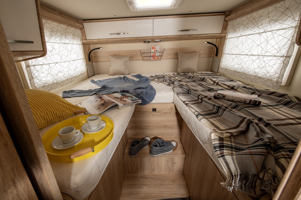Der Eura Mobil Profila T 726 EF bietet zwei Einzelbetten über der zweitürigen Heckgarage, die sich mit einer ausziehbaren Holzlade und einem Zusatzpolster zur Liegewiese erweitern lassen. Mit einer Holz-Schiebetür trennt der Urlauber das Schlafzimmer nach vorne zum Raumbad hin ab.