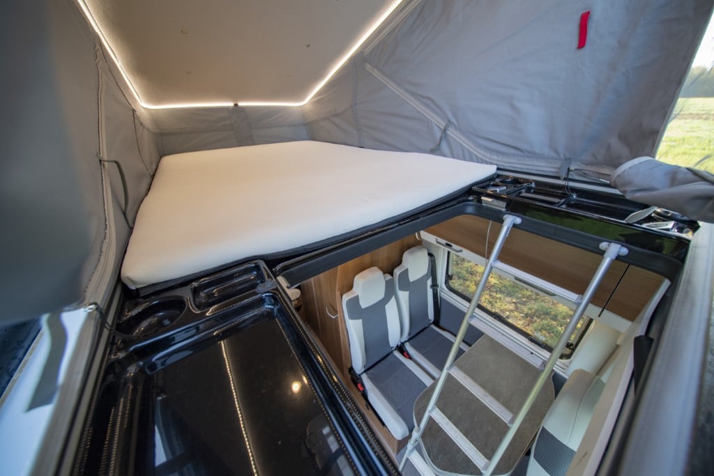 Wichtigstes Extra dürfte aber das Aufstelldach mit 203 mal 130 Zentimeter großer Liegefläche für zwei weitere Urlauber sein. Der Käufer erhält es als Dach-Paket für 4.890 Euro. Dieses Paket enthält neben Dach und Matratze auch die Aufstiegsleiter, LED-Beleuchtung, zwei USB-Anschlüsse sowie einen Ausströmer, so dass die serienmäßige Dieselheizung Truma Combi D neben unterem Geschoss und Warmwasser auch das Oberstübchen temperiert.