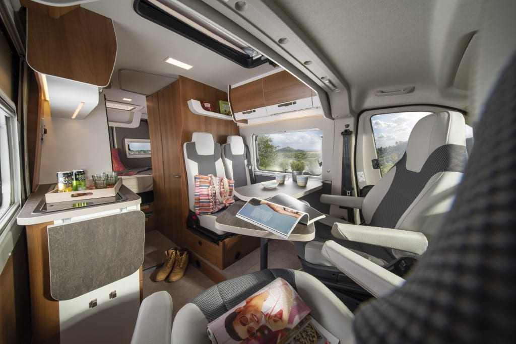Auch bei der Sitzgruppe hat der Vantourer 600 D, wenn auch als Option, ein schönes Detail zu bieten: Für 1.599 Euro montiert der Hersteller statt herkömmlicher Sitzbank zwei Einzelsitze, jeweils mit Dreipunkt-Sicherheitsgurt und Längsverstellung sowie in ihrer Neigung veränderbarer Rückenlehne. Zudem lässt sich der rechte Sitz für mehr Ellenbogenfreiheit in Richtung Mittelgang schieben.