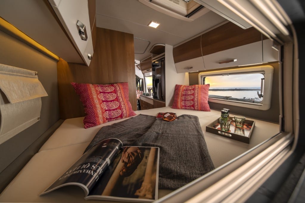 Weitere Besonderheit im Vantourer 600 D ist das Querbett im Heck, bei dem sich vordere und hintere Hälfte gegenläufig bis etwa 90 Grad aufstellen lassen. Die hintere Hälfte ist mit Aufstellern ausgerüstet, mit denen sich der hintere Lattenrost samt Matratze im Aufstellwinkel variieren lässt. Zusammen mit der vorderen Betthälfte ergibt das dann eine Art gemütliches Lese-Sofa im Heck.