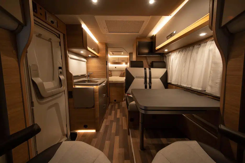 Wer den preisgünstigen Weinsberg Pepper 600 MF betritt, blickt zuerst auf die klassische Halbdinette: Vor der Zweier-Sitzbank mit viel Beinfreiheit hängt der Hersteller an der Seitenwand einen Tisch mit erweiterbarer Platte ein. Die Fahrerhaussitze mit je zwei Armlehnen lassen sich zum Tisch hin drehen und in Neigung und Höhe einstellen.