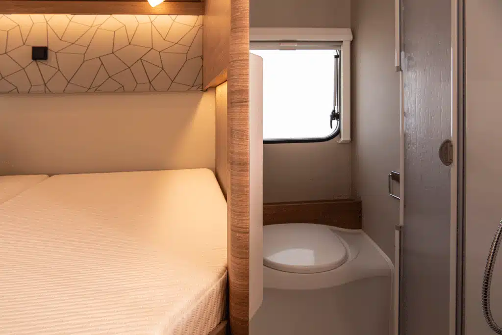Das Bad mit Waschtisch davor ist ein Highlight im Cara Compact Edition Pepper 600 MF: geräumig, mit großer Duschkabine mit leichtgängigen Duschtüren und einer Banktoilette, auf der auch große Camper ihre Füße ausstrecken. Das Duschwasser verlässt das Bad über zwei Abläufe in der Duschwanne. Die Ausleuchtung mit drei LED-Spots ist gut, das optionale Badfenster als Ergänzung zur kleinen Dachhaube empfehlenswert.