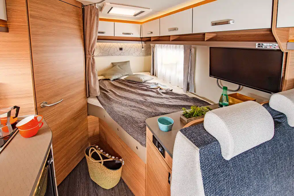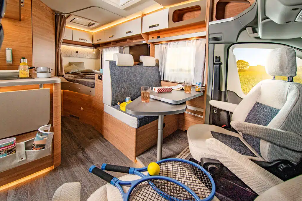 Der im typischen, gefälligen Weinberg-Stil gestaltete Innenraum hat einen angenehm offenen Grundriss mit Blickachse bis ins Heck. Vorne entsteht nach Drehen der Vordersitze und mit dem erweiterbaren, an der Seitenwand eingehängten Tisch sowie mit der Zweier-Sitzbank mit Kopfstützen und Dreipunkt-Sicherheitsgurten eine ausreichend geräumige Halbdinette.